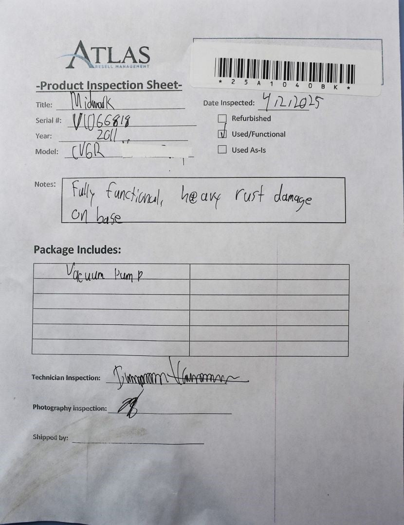 Your purchase will NOT include: N/AThis product is pre-owned and may not include the same accessories as a new, unused unit. - other accessories not shown or listed here.The Midmark CV6R Vacuum Pumps were inspected for motor functionality and water and air flow. The motors both work without delay or grinding. The suction of this unit got to 12Hgs. Water flowed through the unit and out the proper exhaust pipe. The unit is in fair condition with heavy rust and water damage on its base. Inspection Result: Passed - Ready for Resale