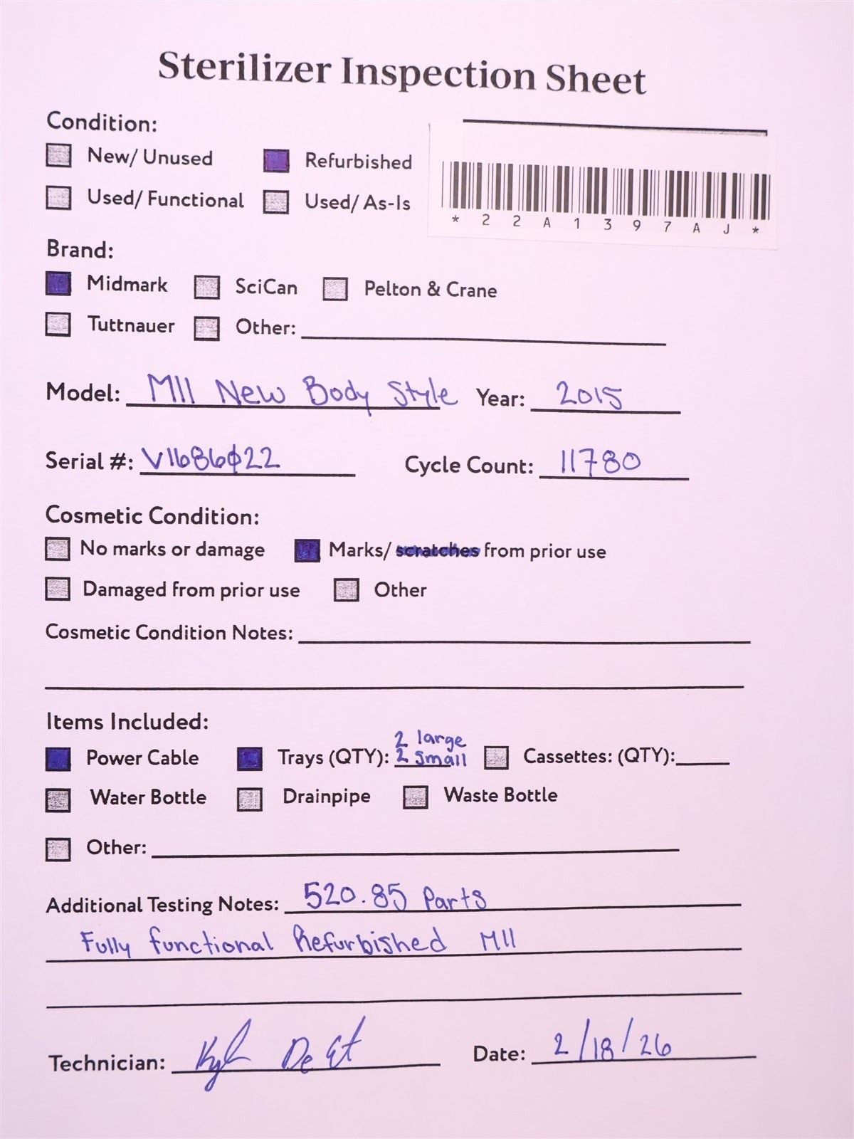 Your purchase will NOT include: - other accessories not shown or listed here.This autoclave is a 2015 model with 11,780 cycles run on it. An Initial functionality test was done, and all major components were found to be working. Then this autoclave,was disassembled down to the bare chassis, cleaned, rebuilt and refurbished. Removed and rebuilt the Door Latch assembly. Cleaned Reservoir Tank and installed a new Drain Hose and Condenser Coil. Installed a new Fill / Vent Valve Manifold Assembly and Air Valve Solenoid. Installed a new Door Gasket, Dam Gasket, Heating Element, and Mesh Water Filters. Cleaned the Sterilizing Trays and Rack. Then proceeded to test the sterilizer. Connected it to a 120 volt power source, added distilled water and ran the autoclave through all it's preset sterilizing and drying cycles. To verify that this autoclave is achieving it's required maximum sterilizing temperature, it was temperature tested using a Max Register Thermometer, and found to reach 273 F for an entire cycle.