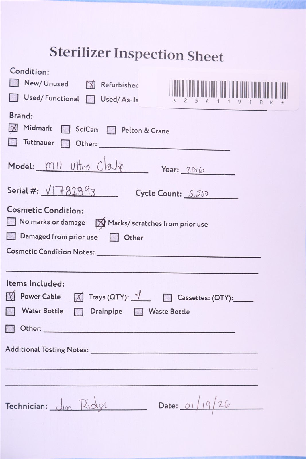 1 - Midmark M11 UltraClave 4 - Sterilizing Trays w/ Rack 1 - Power Cord