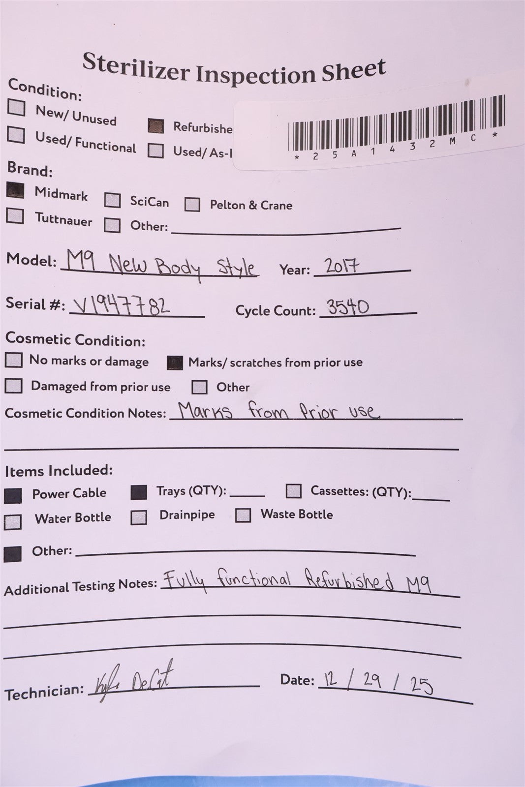 M9 NEW BODY Prior to testing this autoclave, it was disassembled down to the bare chassis, cleaned, rebuilt and refurbished. Removed and rebuilt the Door Latch assembly. Cleaned Reservoir Tank and installed a new Drain Hose and Condenser Coil. Installed a new Fill / Vent Valve Manifold Assembly and Air Valve Solenoid. Installed a new Door Gasket, Dam Gasket, Heating Element, and Mesh Water Filters. Installed a new Keypad. Cleaned the Sterilizing Trays and Rack. Then proceeded to test the sterilizer. Connected it to a 120 volt power source, added distilled water and ran the autoclave through all it's preset sterilizing and drying cycles. To verify that this autoclave is achieving it's required maximum sterilizing temperature, it was temperature tested using a Max Register Thermometer, and found to reach 273 F for an entire cycle.