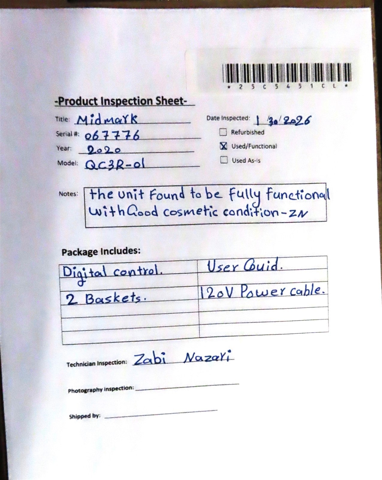 Visually inspected the unit for any damaged or missing parts and accessories the unit found to be fully functional with good cosmetic condition.-ZN