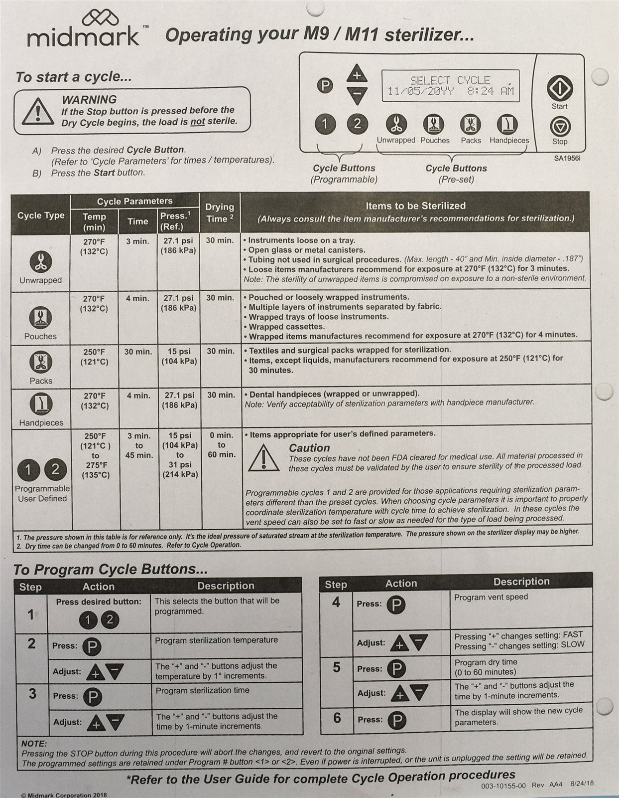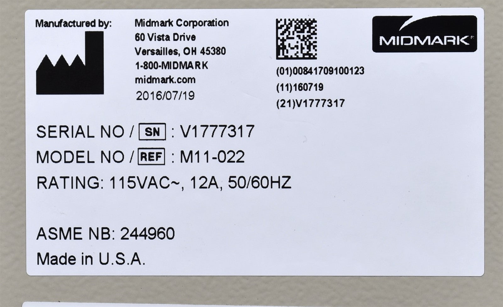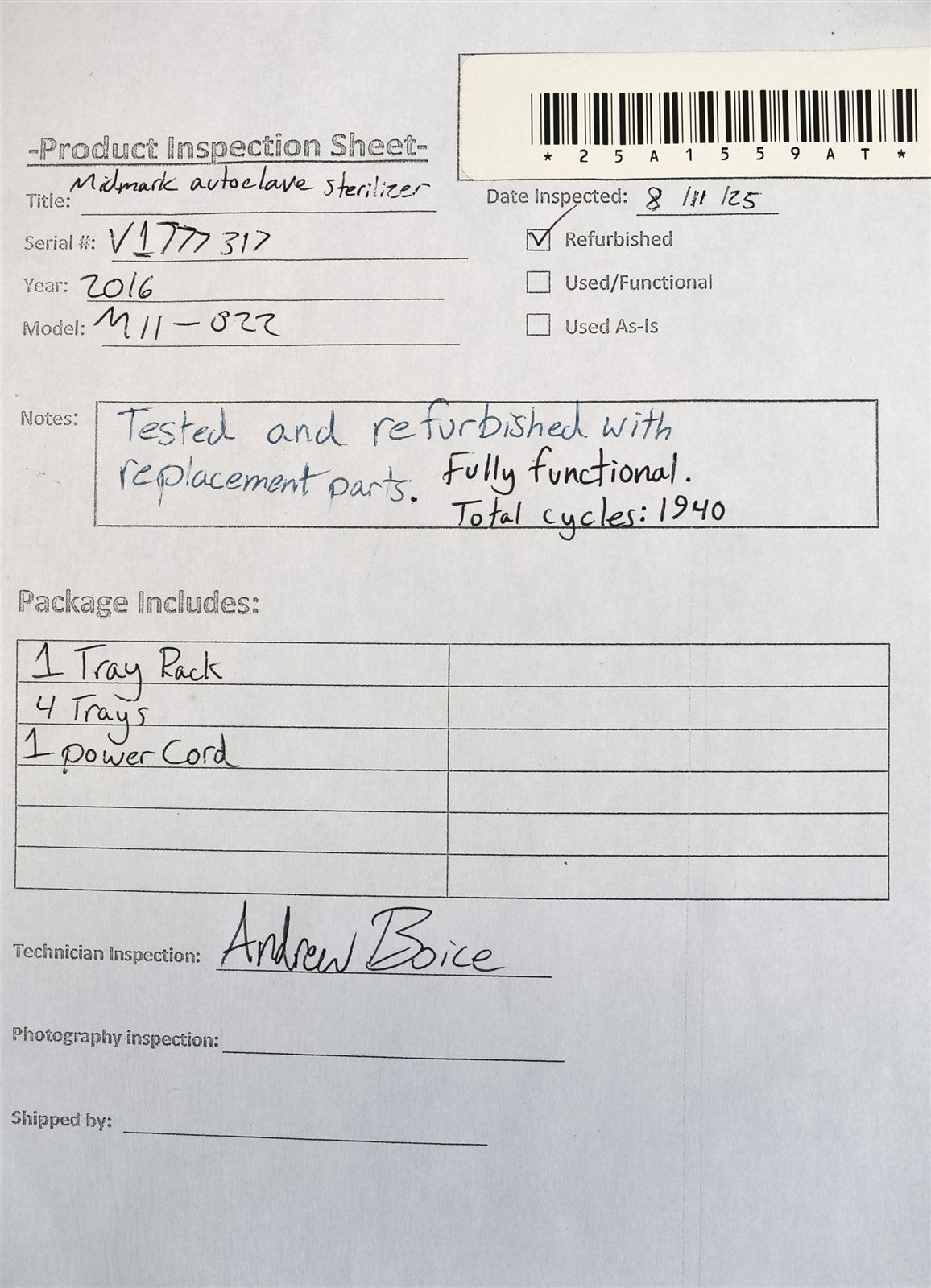 Your purchase will NOT include: - other accessories not shown or listed here.Midmark Ritter M11 – Comfortable and Reliable Dental ChairErgonomic Patient Comfort Designed to provide excellent support and comfort for patients during procedures. Adjustable positioning allows optimal access while maintaining patient relaxation.User-Friendly Operation Intuitive controls and smooth adjustments help dental professionals work efficiently. Customizable settings allow easy integration into any operatory workflow.Durable and Long-Lasting Constructed with high-quality materials for reliable daily use. Designed for easy maintenance and long-term performance in busy dental practices.Optimized Workflow Compact design fits seamlessly into modern operatories. Streamlined operation supports efficient procedures and improved ergonomics for the dental team.Midmark Ritter M11 — A dependable and comfortable dental chair built for patient care and clinical efficiency.Prior to testing this autoclave, it was disassembled down to the bare chassis, cleaned, rebuilt and refurbished. The Door Latch assembly was disassembled, cleaned and rebuilt, and was tested to insure proper opening of the chamber door during the dry cycle. Installed a new Reservoir Tank, Drain Hose and Condenser Coil. Installed a new Fill / Vent Valve Manifold Assembly and Air Valve Solenoid. Installed a new Door Panel, Door Gasket, Dam Gasket, Heating Element, and Mesh Water Filters. Installed a new Safety Valve, Top Panel, LCD Display and Keypad. Cleaned the Sterilizing Trays and Rack. Then proceeded to test the sterilizer. Connected it to a 120 volt power source, added distilled water and ran the autoclave through all it's preset sterilizing and drying cycles. To verify that this autoclave is achieving it's required maximum sterilizing temperature, it was temperature tested using a Max Register Thermometer, and found to reach 273 F for an entire cycle.