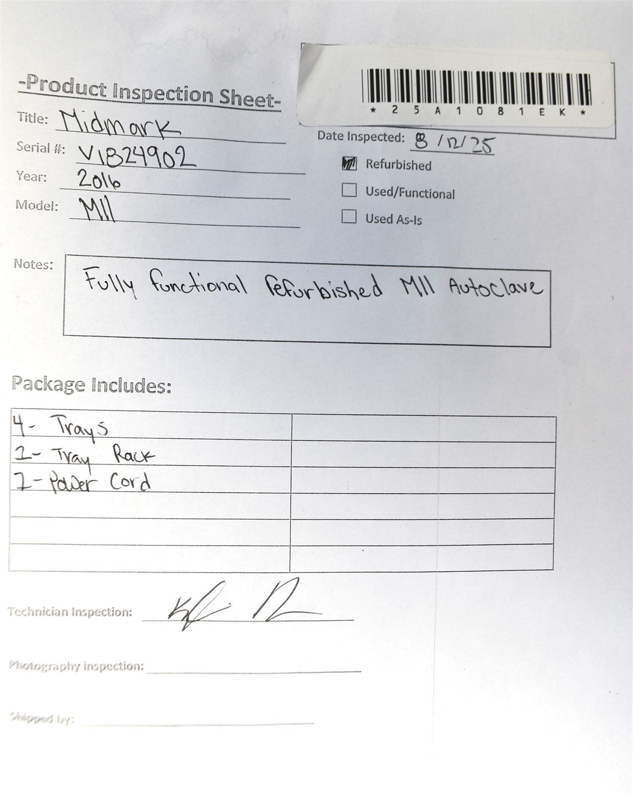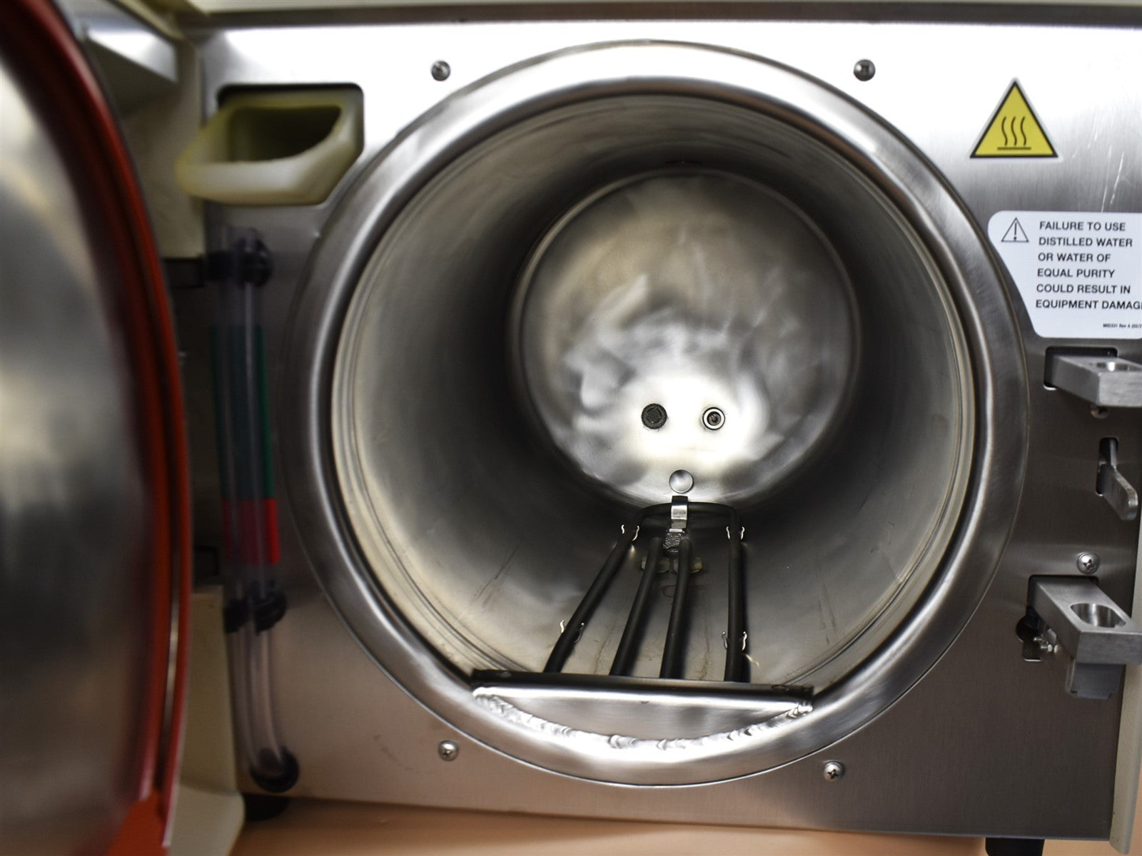 Your purchase will NOT include: - other accessories not shown or listed here. Large Chamber Capacity: Features an 11" x 18" chamber, accommodating larger instrument sets and reducing sterilization cycles. Steam-Flush Pressure Pulse Air Removal: Ensures proper steam penetration for effective sterilization. Pre-Programmed Cycles: Offers intuitive, pre-programmed cycles for unwrapped items, pouches, packs, and handpieces. Automatic Door: Quietly opens to dissipate steam and facilitate efficient drying of instruments. Front-Fill and Drain: Allows easy filling and draining without moving the unit, enhancing convenience. Real-Time Alerts: Provides notifications for critical system errors, ensuring safe operation. Optional Printer: Available for recording sterilization data, including cycle time, temperature, and pressure. Compact Design: Despite its large chamber, the unit's dimensions are 23.8" (L) x 17.8" (W) x 18.1" (H), fitting standard countertops.Prior to testing this autoclave, it was disassembled down to the bare chassis, cleaned, rebuilt and refurbished. Removed and rebuilt the Door Latch assembly. Cleaned Reservoir Tank and installed a new Drain Hose and Condenser Coil. Installed a new Fill / Vent Valve Manifold Assembly and Air Valve Solenoid. Installed a new Door Gasket, Dam Gasket, Heating Element, and Mesh Water Filters. Installed a new Keypad. Cleaned the Sterilizing Trays and Rack. Then proceeded to test the sterilizer. Connected it to a 120 volt power source, added distilled water and ran the autoclave through all it's preset sterilizing and drying cycles. To verify that this autoclave is achieving it's required maximum sterilizing temperature, it was temperature tested using a Max Register Thermometer, and found to reach 273 F for an entire cycle.