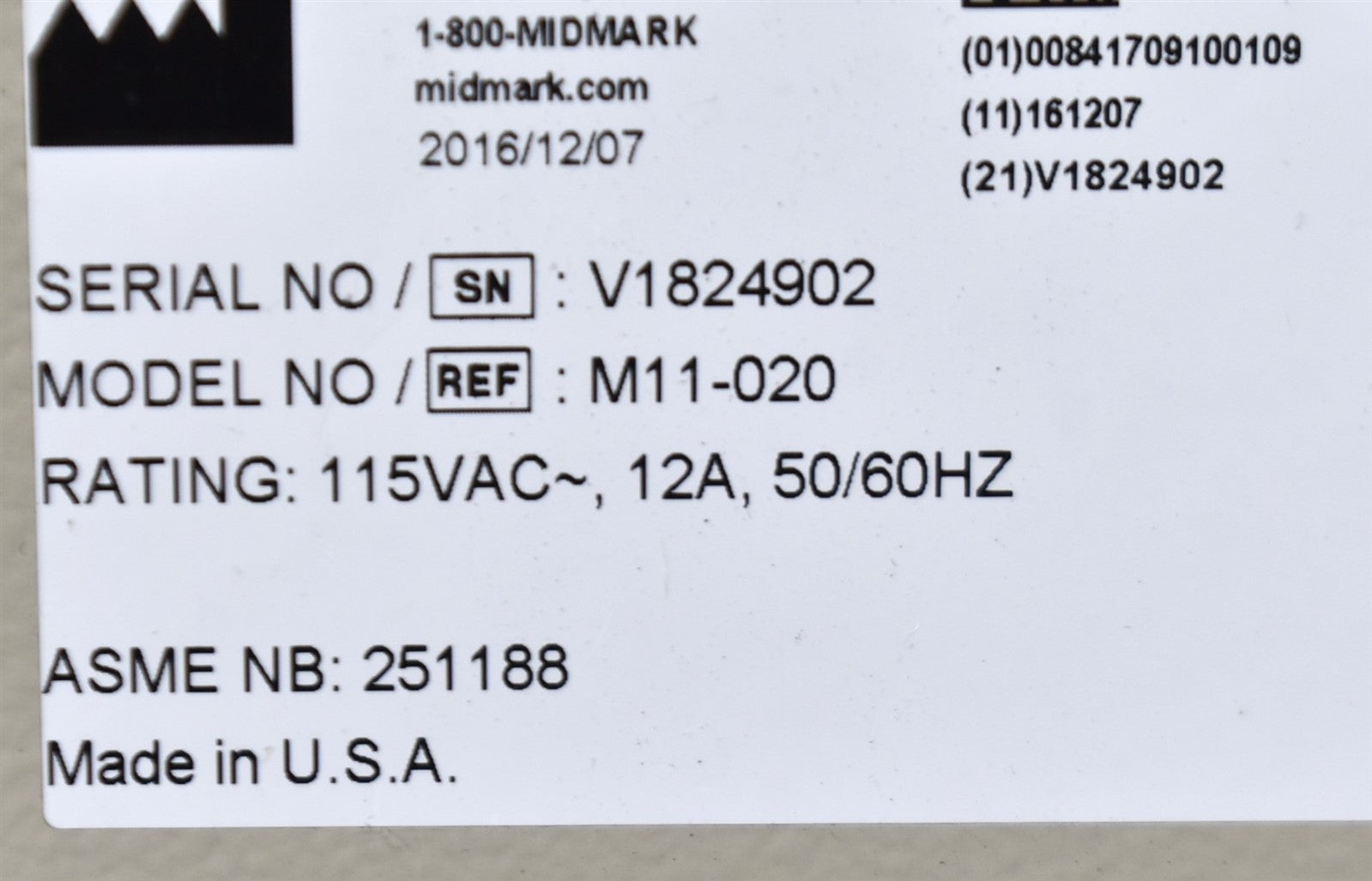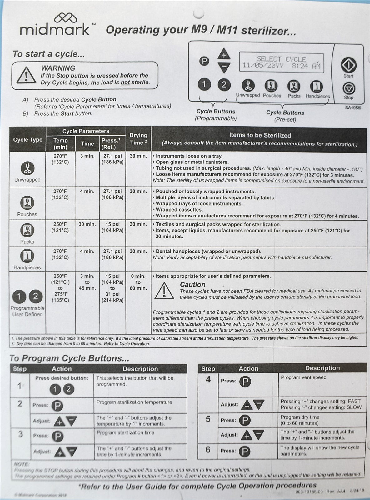 Prior to testing this autoclave, it was disassembled down to the bare chassis, cleaned, rebuilt and refurbished. Removed and rebuilt the Door Latch assembly. Cleaned Reservoir Tank and installed a new Drain Hose and Condenser Coil. Installed a new Fill / Vent Valve Manifold Assembly and Air Valve Solenoid. Installed a new Door Gasket, Dam Gasket, Heating Element, and Mesh Water Filters. Installed a new Keypad. Cleaned the Sterilizing Trays and Rack. Then proceeded to test the sterilizer. Connected it to a 120 volt power source, added distilled water and ran the autoclave through all it's preset sterilizing and drying cycles. To verify that this autoclave is achieving it's required maximum sterilizing temperature, it was temperature tested using a Max Register Thermometer, and found to reach 273 F for an entire cycle.