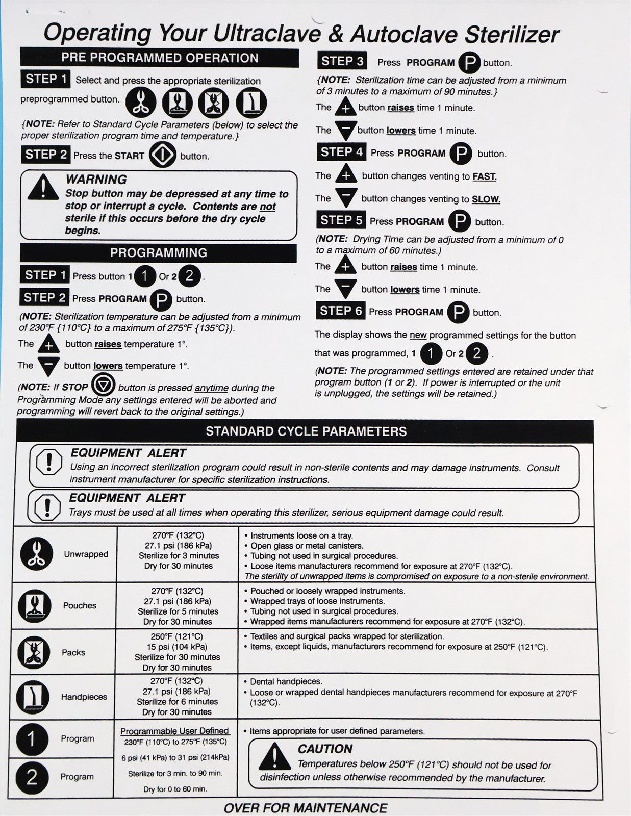 M11 NEW BODY Prior to testing this autoclave, it was disassembled down to the bare chassis, cleaned, rebuilt and refurbished. Removed and rebuilt the Door Latch assembly. Cleaned Reservoir Tank and installed a new Drain Hose and Condenser Coil. Installed a new Fill / Vent Valve Manifold Assembly and Air Valve Solenoid. Installed a new Door Gasket, Dam Gasket, Heating Element, and Mesh Water Filters. Installed a new Keypad. Cleaned the Sterilizing Trays and Rack. Then proceeded to test the sterilizer. Connected it to a 120 volt power source, added distilled water and ran the autoclave through all it's preset sterilizing and drying cycles. To verify that this autoclave is achieving it's required maximum sterilizing temperature, it was temperature tested using a Max Register Thermometer, and found to reach 273 F for an entire cycle.-