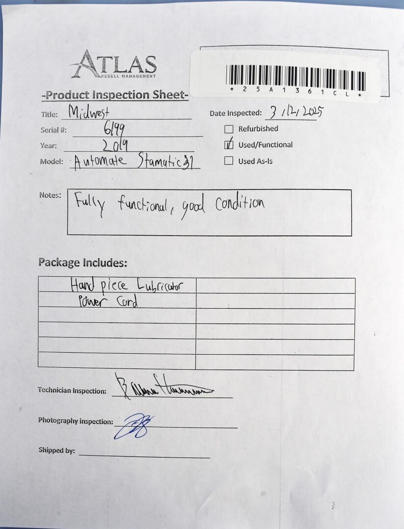 The Midwest Automate Stamatic 31 was inspected for its air and lubrication flow. The unit runs air and lubrication through each of its slots without issue. Inspection Result: Passed - Ready of Resale