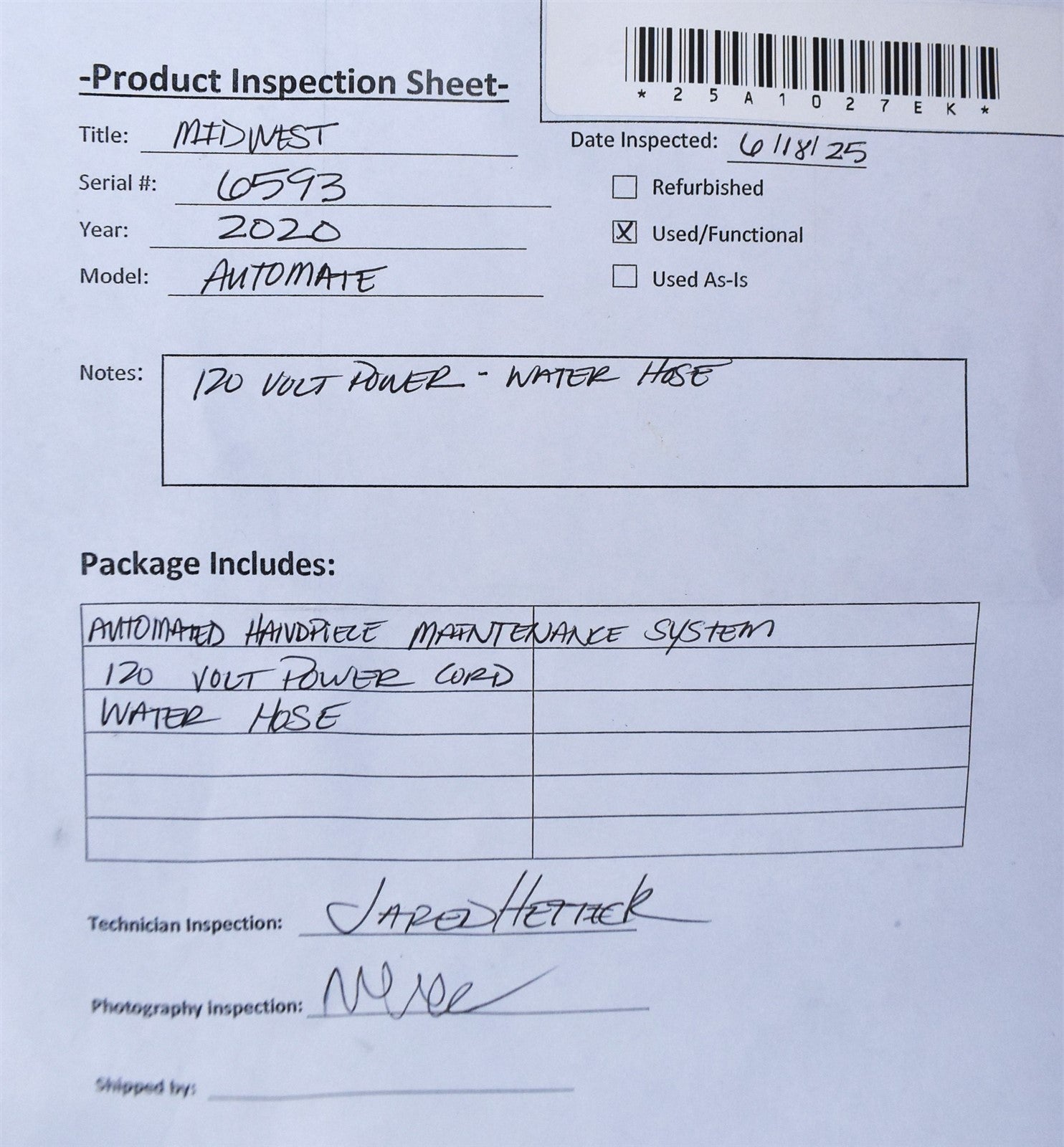 The Midwest Automate-Connect the air tube and power supply.Insert the Midwest Plus Automate Spray can into the spray chamber.The unit was cleaned and disinfected Unit, Pass: Ready for resale.