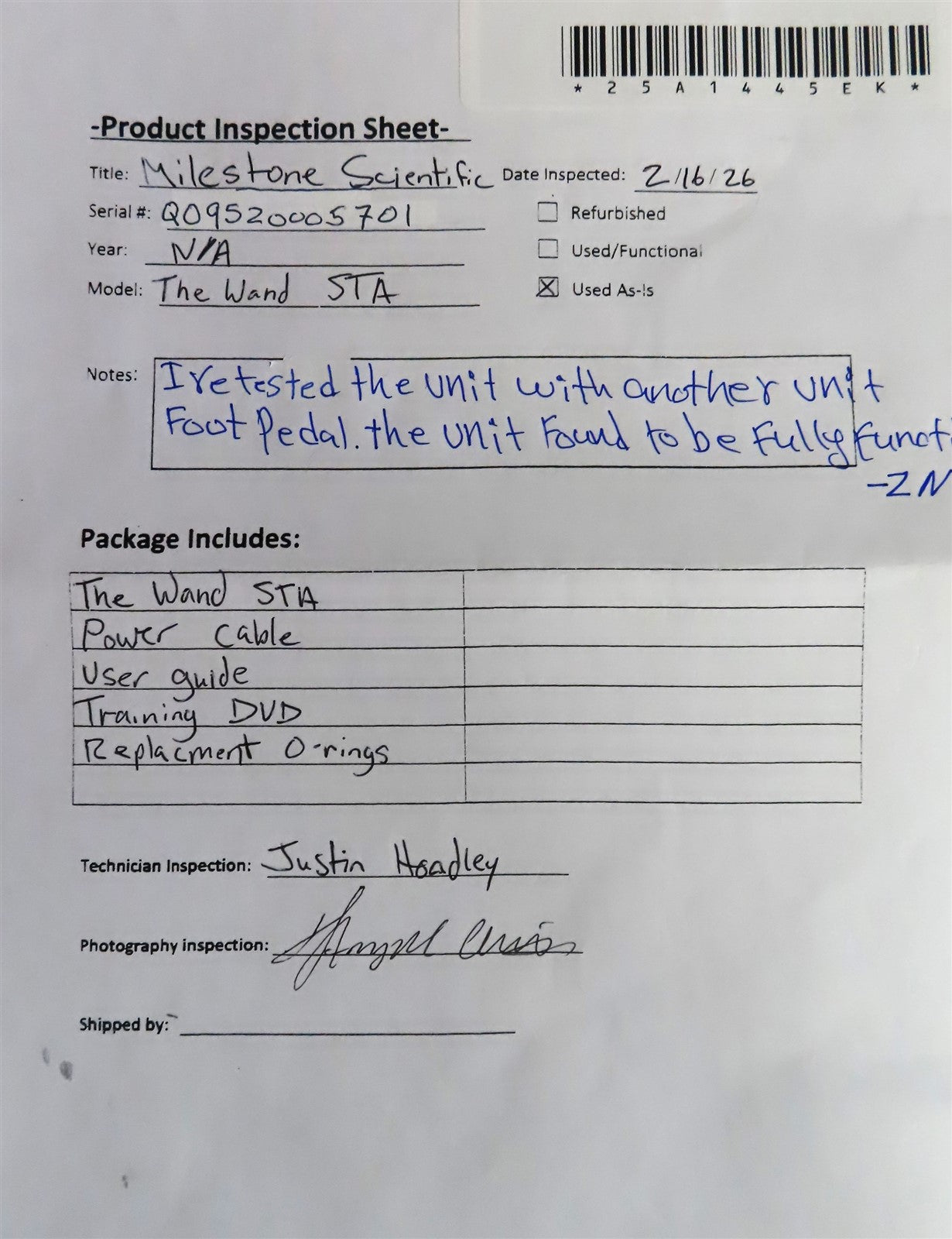 Milestone Scientific The Wand STA System, power cable, user guide, training dvd, and replacement o-rings