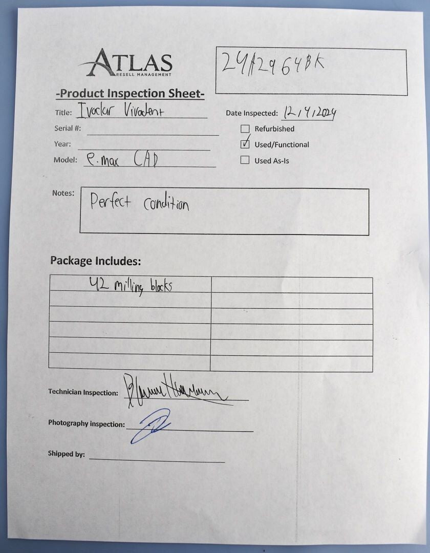 Atlas Resell Management has more experience testing and shipping CEREC and other CAD/CAM units than anyone else on eBay. Just check out the wide selection of CAD/CAM units in our store.We're proud to be the most trusted source for quality used CAD/CAM units in the pre-owned dental equipment market. Your purchase will NOT include: This product is pre-owned and may not include the same accessories as a new, unused unit. - other accessories not shown or listed here.I did a visual inspection and took stock of the unit. All blocks are present and in perfect condition. -BH