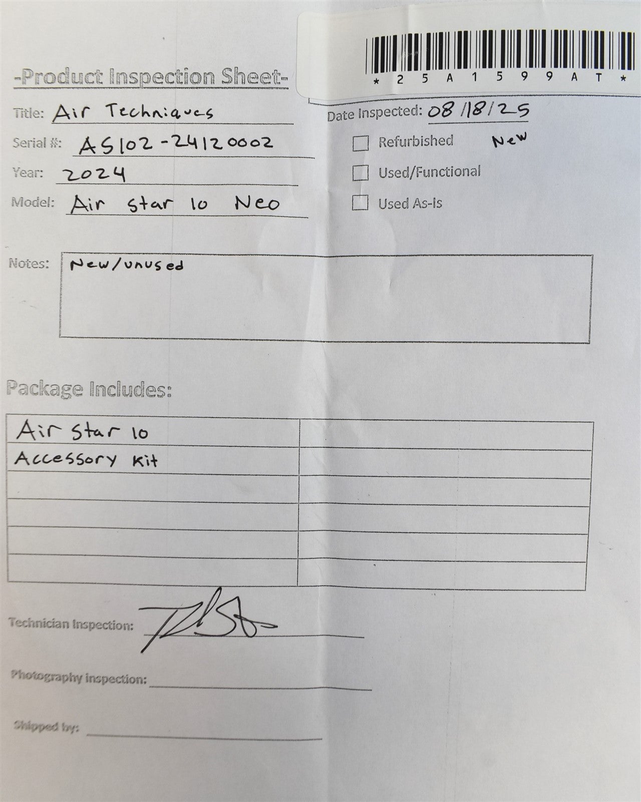 Your purchase will NOT include: - other accessories not shown or listed here. Air Techniques AirStar 10 NEO Dental Air Compressor (2024) - Key Features Air Techniques AirStar 10 NEO Dental Air Compressor (2024) - Key Features 100% Oil-Free Operation: Provides clean, hygienic compressed air, eliminating oil contamination to protect dental handpieces and ensure patient safety. Exclusive Membrane Dryer Technology: Quadruple filtration system (once at compressor head, twice at dryer, once at tank exit) delivers ultra-dry, pure air for optimal performance. Advanced Virus-Bacteria Filters: Tested by SGS Frisenius Institute with >99.99995% particle retention, ensuring superior protection against viruses and microorganisms. Full-Color Digital Touchscreen: Intuitive interface offers real-time diagnostic monitoring, user-friendly controls, and remote access to settings for seamless operation. Smart Alarms System: Integrated diagnostics provide preventative maintenance alerts, enhancing reliability and minimizing downtime. Supports Up to Two Users: Designed to power dental handpieces for up to two simultaneous users, ideal for small dental practices. Low-Pressure Dew Point: Maintains humidity levels below NFPA standards, preventing damp conditions that could affect equipment or air quality. Vision Monitor Integration: Cloud-based IoT platform supports live status updates, remote support, and scalable monitoring for single or multi-office setups. Virtually Maintenance-Free: Engineered for minimal upkeep with specialized maintenance kits, ensuring consistent performance with routine filter replacements. Quiet and Compact Design: Low noise output and space-saving footprint enhance patient comfort and fit seamlessly into small dental office environments.Visually inspected the unit for any damages or missing parts and accessories. This unit is new/unused.