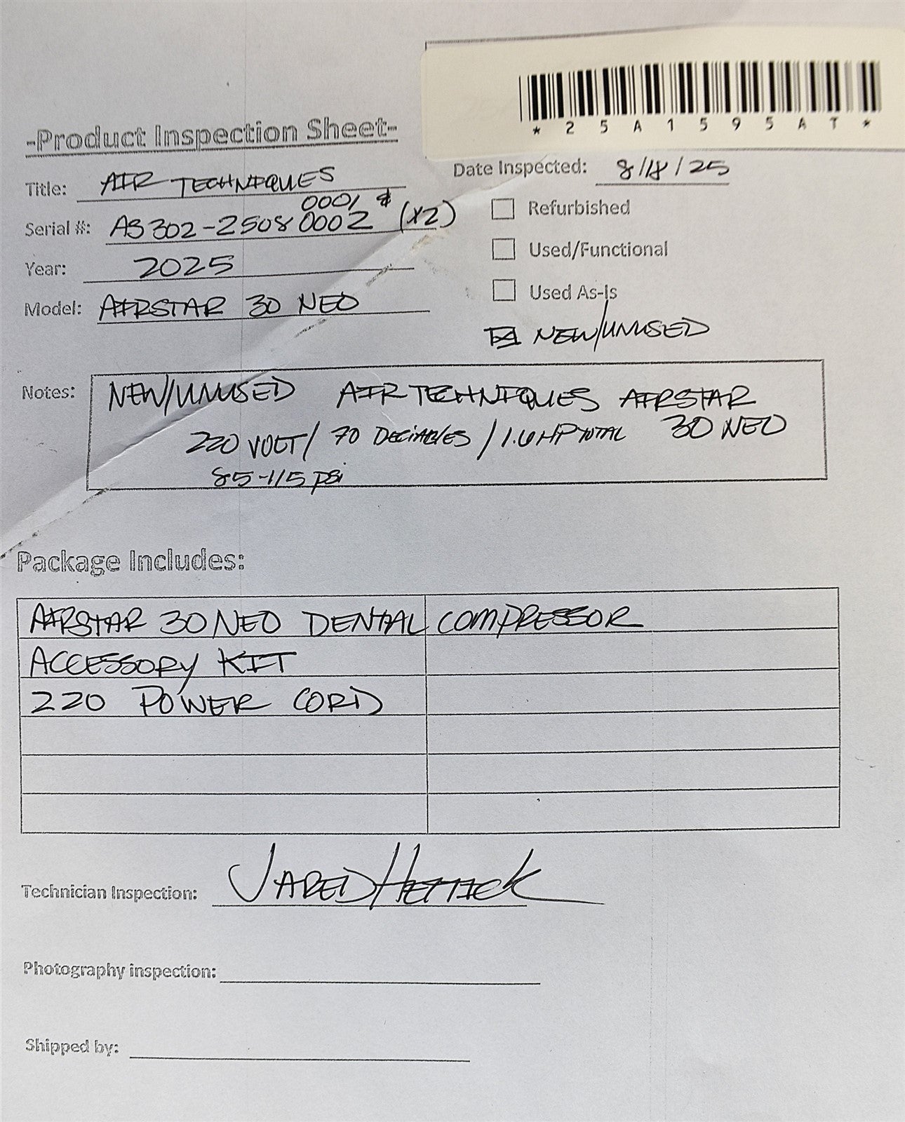 Your purchase will NOT include: - other accessories not shown or listed here. Air Techniques AirStar 30 NEO Dental Air Compressor (2025) - Key Features Air Techniques AirStar 30 NEO Dental Air Compressor (2025) - Key Features 100% Oil-Free Operation: Delivers ultra-clean, hygienic compressed air, eliminating oil residues to ensure patient safety and protect dental equipment. Exclusive Membrane Dryer Technology: Quadruple filtration (once at compressor head, twice at dryer, once at tank exit) provides exceptionally dry, contamination-free air. High-Efficiency Virus-Bacteria Filters: Independently tested by SGS Frisenius Institute, retaining >99.99995% of particles for superior infection control. Full-Color Touchscreen Display: Digital interface offers real-time diagnostics, user-friendly controls, and remote access to settings for seamless operation. Smart Alarms for Maintenance: Integrated diagnostic system provides timely alerts for preventative maintenance, maximizing uptime and equipment longevity. Supports Up to Four Users: Designed to power dental handpieces for up to four simultaneous users, ideal for medium-sized dental practices. Low-Pressure Dew Point: Maintains humidity levels well below NFPA standards, preventing damp conditions that could compromise air quality or equipment. Vision Monitor Compatibility: Integrates with cloud-based IoT platform for live status updates, remote configuration, and scalable monitoring across single or multiple offices. Virtually Maintenance-Free: Engineered for minimal upkeep with specialized maintenance kits, ensuring consistent performance with routine filter replacements. Quiet and Compact Design: Low noise output and space-saving footprint enhance patient comfort and fit seamlessly into any dental office environment.NEW UNUSED , no test needed.