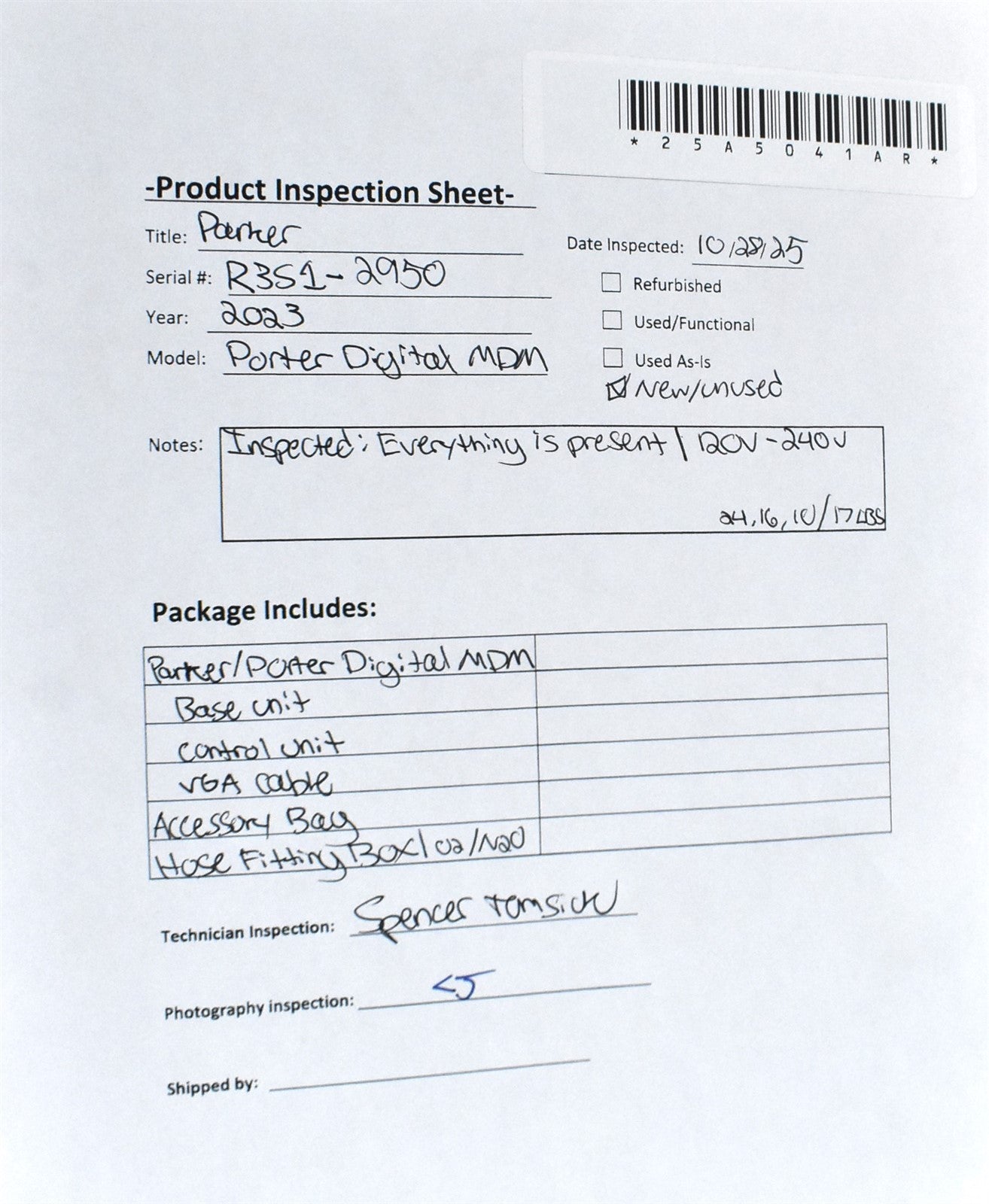Verified that all components are present, undamaged, and document condition without powering on the unit.