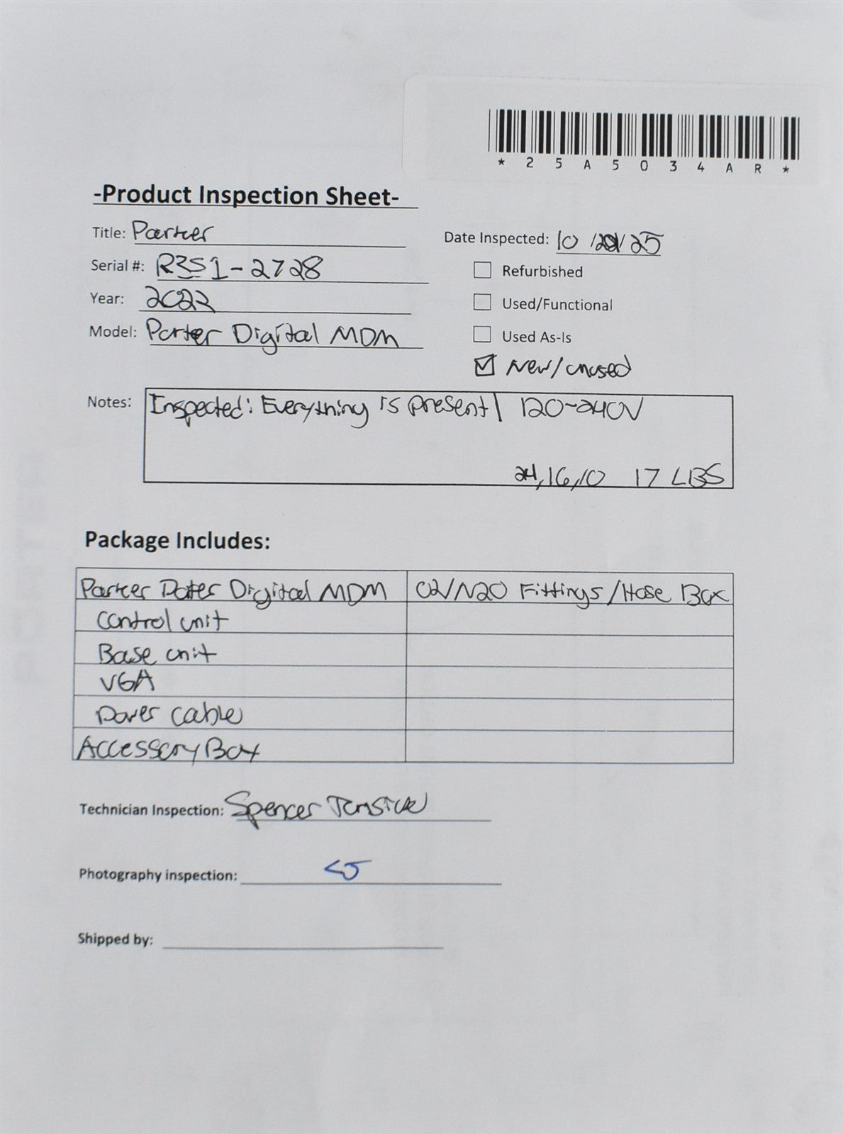Parker/Porter Digital MDM, Base unit, Control Unit, VGA cable, Accessory Bag, O2/N20 Hose and Fitting Box