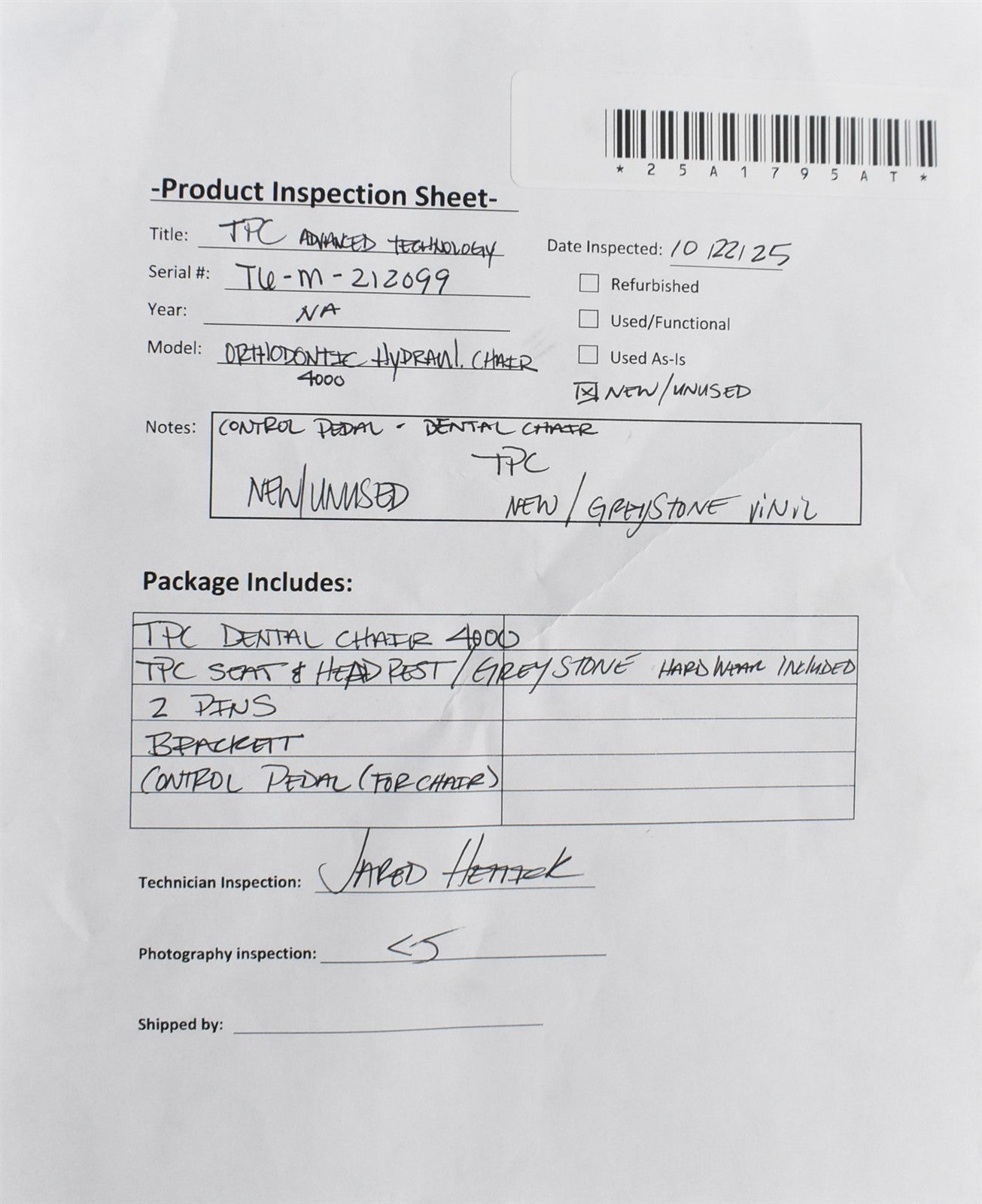 TPC Dental Chair 4000, TPC seat & head rest / Greystone, 2 Pins, Brackett, Control pedal (For Chair), Hardware included.