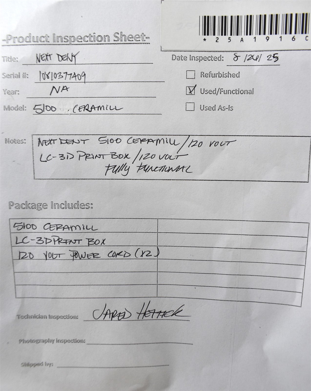 Your purchase will NOT include:This product is pre-owned and may not include the same accessories as a new, unused unit. - other accessories not shown or listed here. NextDent 5100 3D Printer for dental applications High-speed, high-precision DLP 3D printing technology Compatible with a wide range of NextDent biocompatible resins Large build volume for crowns, bridges, dentures, and orthodontic models Easy-to-use software with intuitive workflow and print management Reliable and consistent print quality for professional dental labs Fast print times for increased productivity Compact and durable design for modern dental practice or lab Supports multiple types of dental restorations and appliances Trusted by dental professionals worldwide for accuracy and performancePowered on both Units, 120 volt. Checked over Units for damage and defects. Both display screens working properly. Units have been cleaned and disinfected. Inspection Result: - Ready for Resale.