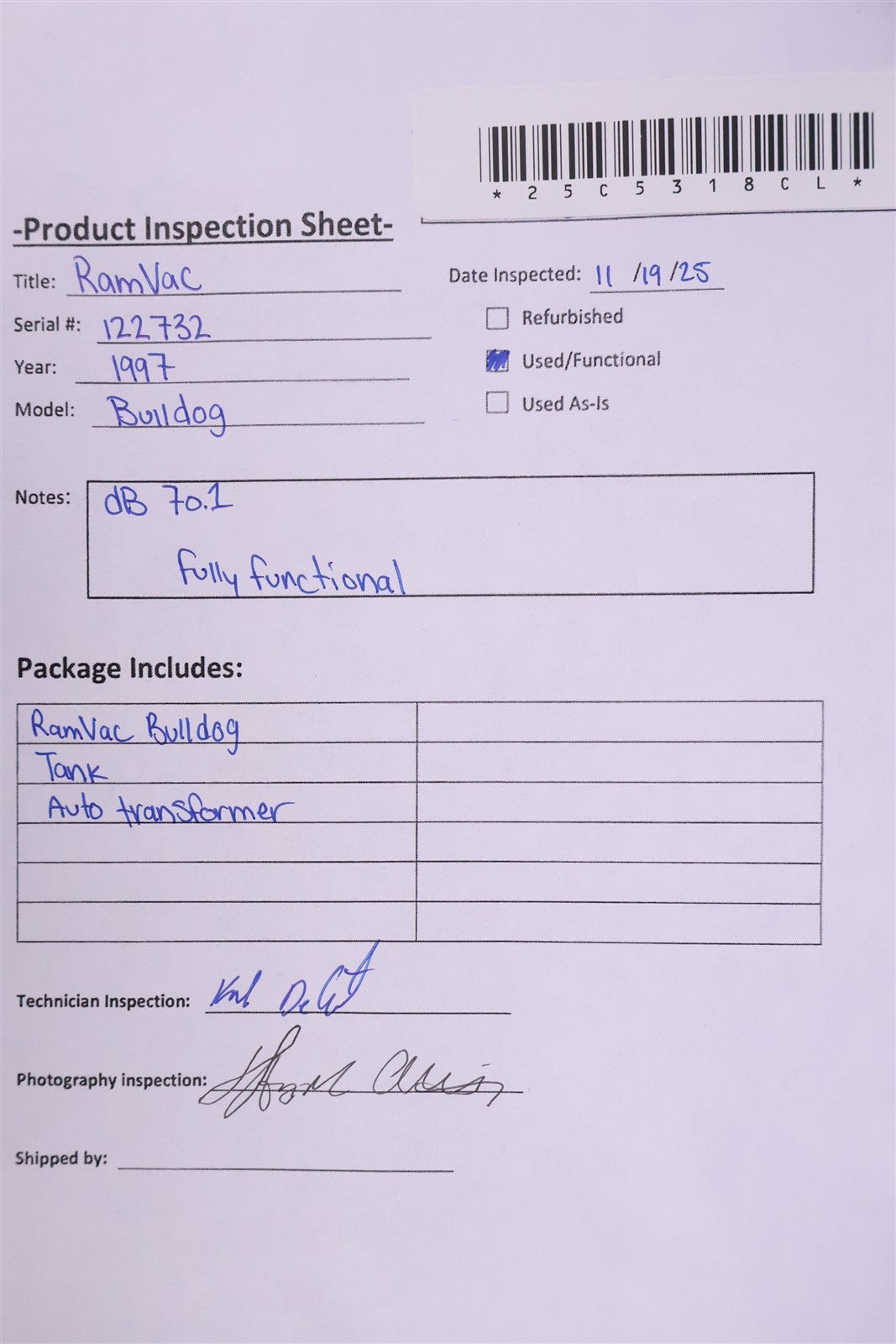 Your purchase will NOT include: This product is pre-owned and may not include the same accessories as a new, unused unit. - other accessories not shown or listed here.Prior to function testing this RamVac Bulldog Vacuum pump system, it was visually inspected for any damage or missing components that would interfere with units complete functionality. Unit is complete, including transformer, tank, RamVac Bulldog, and the bulldog has adequate oil level. Proceeded to hardwire unit to required 220V power source, upon plugging unit in motor kicked on immediately. Obtained dB reading which is 70.1. Allowed unit to run for a few minutes to ensure motor has no issues. FINAL INSPECTION STATUS= PASSED/FULLY FUNCTIONAL