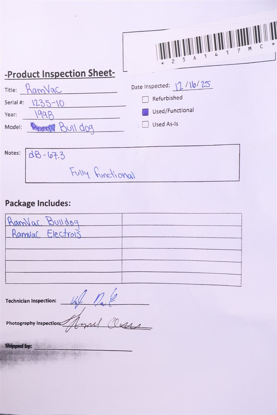 Prior to function testing this RamVac Bulldog QT it was visually inspected for any damage or missing components that would interfere with the units complete desired function. Unit is complete and free of significant damage. Proceeded to hardwire 220V cable, and plugged unit in. Units motor immediately kicked in. Gathered dB reading, which is 67.3-68. Allowed unit to run for a few minutes to ensure no functionality concerns with continuous use. FINAL PRODUCT INSPECTION- PASSED/ FULLY FUNCTIONAL.