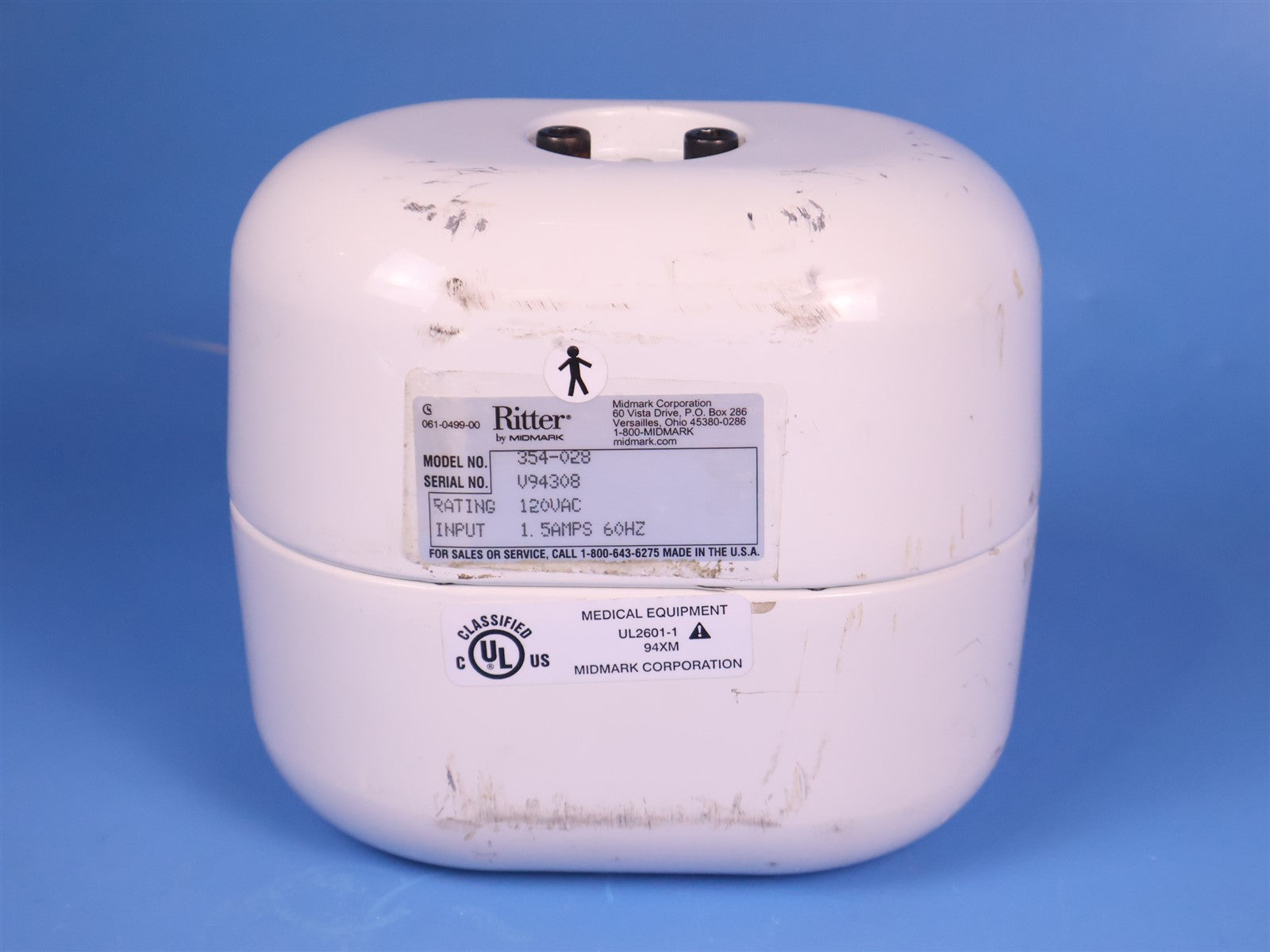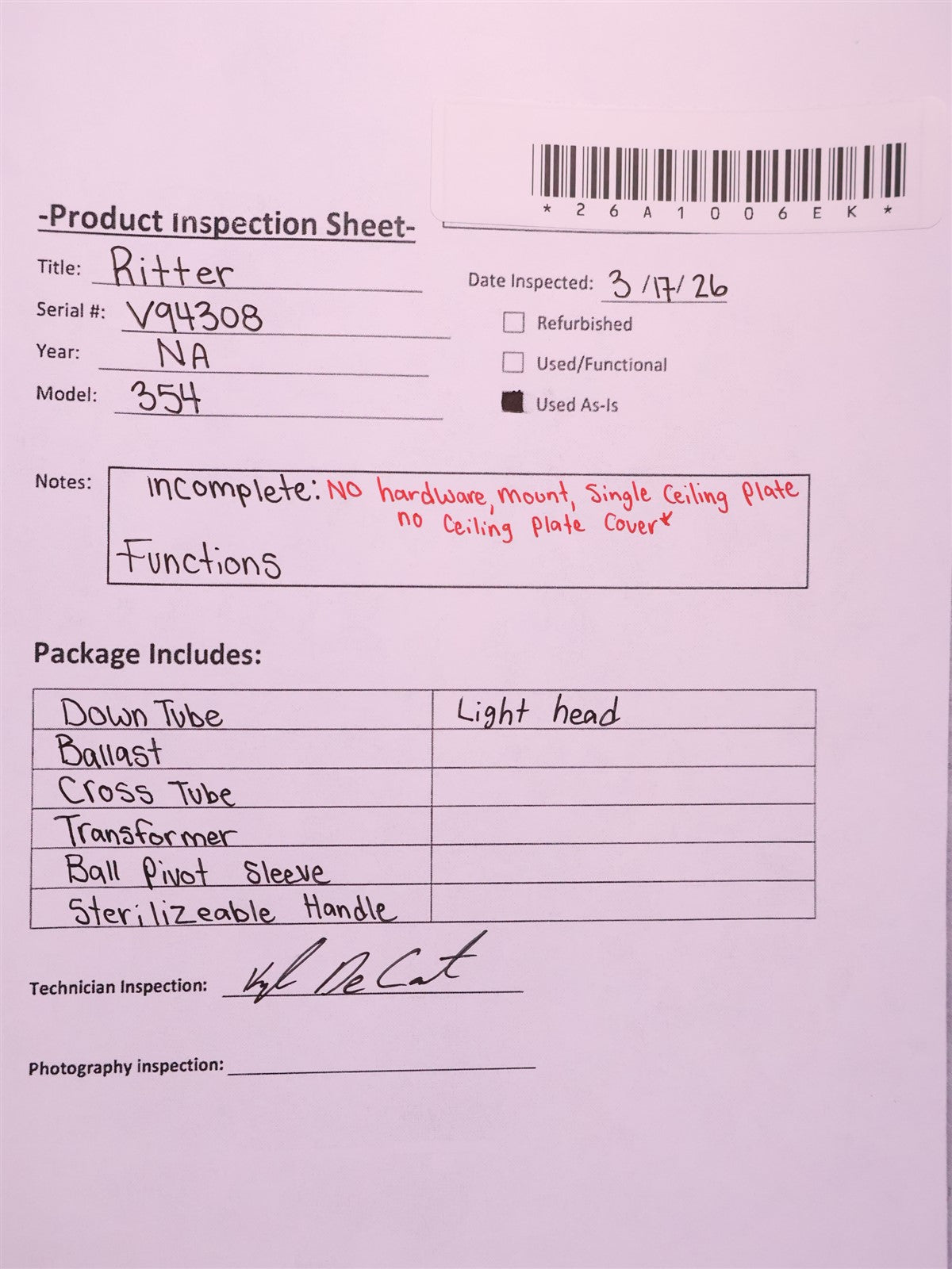 Your purchase will NOT include: MISSING SINGLE CEILING PLATE AND COVER, MOUNT AND HARDWARE MOUNT, POWER CORD - other accessories not shown or listed here.The Midmark Ritter 355 Procedure Light is a medical and dental procedure light designed to provide bright, focused illumination during examinations and minor surgical procedures. The light uses a 100-watt halogen bulb that produces a neutral white light with a color temperature of approximately 4,200 K, helping maintain accurate tissue color visibility while reducing excessive heat. The system produces up to 53,800 lux of illumination at a 24-inch focal distance with an 8-inch diameter light pattern and a 35-inch depth of field, allowing clear lighting over a wide treatment area. The light head is a ceiling mounted on a counterbalanced suspension arm system. This unit underwent a complete product inspection, visual and functionality. During visual inspection noticed unit is MISSING SINGLE CEILING PLATE AND COVER, MOUNT AND HARDWARE MOUNT, POWER CORD. Observed cosmetic damage to lens cover/face plate MINOR CRACK. UNIT IS INCOMPLETE BUT INCLUDES REQUIRED COMPONENTS FOR FUNCTION. JUST NOT SET UP. Proceeded to hardwire transformer to required 120V power source. Powering unit on by switch on cross tube. Halogen bulb responded illuminating through lens as intended. FINAL PRODUCT QUALITY INSPECTION STATUS. INCOMPLETE/ USED AS-IS WITH COMSETIC CONDITION NOTED.