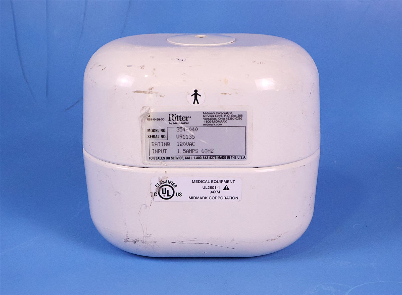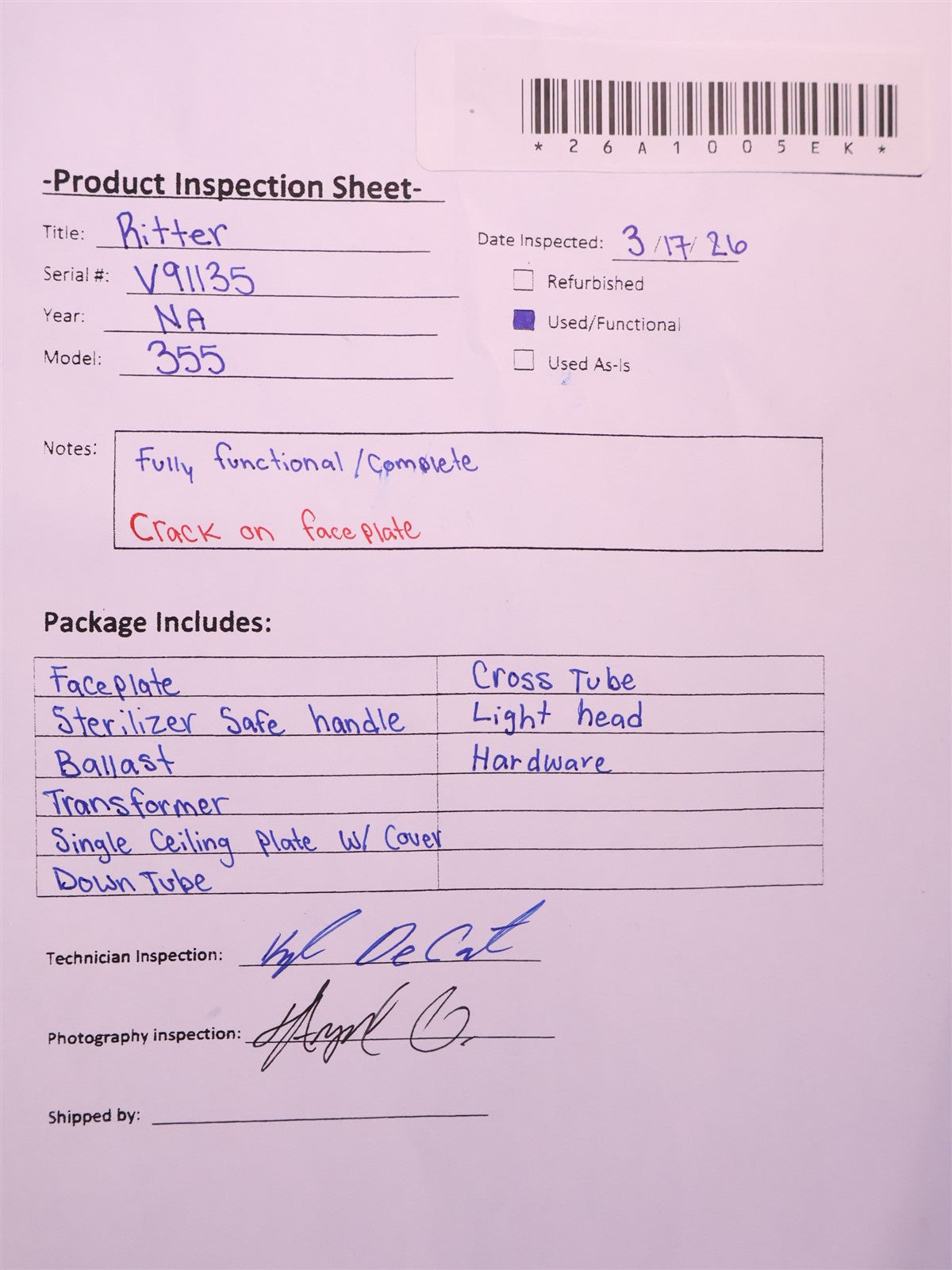 Your purchase will NOT include:This product is pre-owned and may not include the same accessories as a new, unused unit. - other accessories not shown or listed here.The Midmark Ritter 355 Procedure Light is a medical and dental procedure light designed to provide bright, focused illumination during examinations and minor surgical procedures. The light uses a 100-watt halogen bulb that produces a neutral white light with a color temperature of approximately 4,200 K, helping maintain accurate tissue color visibility while reducing excessive heat. The system produces up to 53,800 lux of illumination at a 24-inch focal distance with an 8-inch diameter light pattern and a 35-inch depth of field, allowing clear lighting over a wide treatment area. The light head is mounted on a counterbalanced suspension arm system. This Ritter 355 procedure light underwent a complete product quality inspection. Prior to functionality inspection; visually inspected for any damage/missing components that would interfere with units complete desired function. Unit includes Faceplate (with MINOR damage to lower end), sterilizable handle,ballast, transformer, single ceiling plate, downtube, cross tube/bearing assy, light head. Moved on to properly hardwiring transformer to required 120V power source, and connecting wire harness. Powered unit on with power switch on cross tube. Halogen illuminated a bright beam. NO MECHANICAL DEFECTS, COSMETICALLY IN FAIR CONDITION WITH MINOR DAMAGE TO FACEPLATE AND SCUFFING THROUGHOUT. FINAL PRODUCT QUALITY INSPECTION STATUS- PASSED WITH COSMETIC CONDITION NOTED.