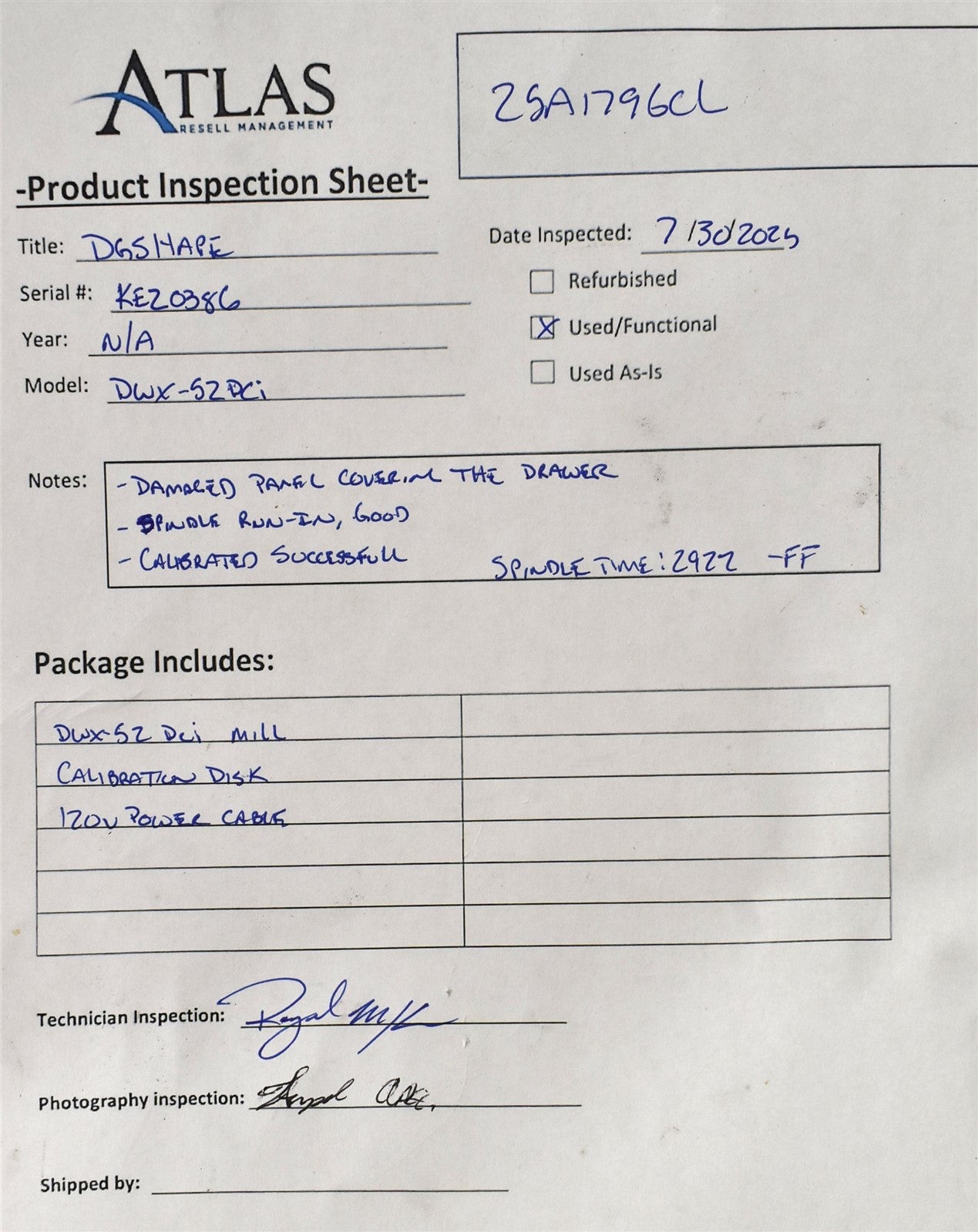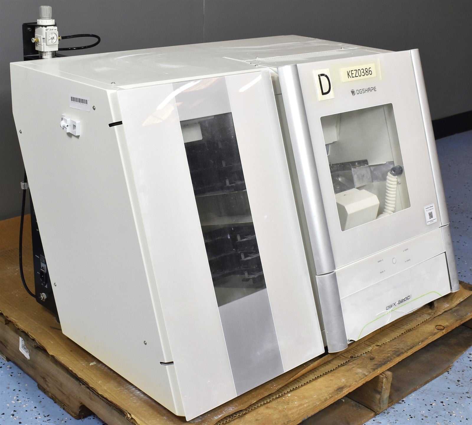 Visually inspected the unit for any damaged or missing parts and accessories. The plexiglass the covers the drawer is damaged and needs to be replaced. Connected the unit to pressurized air supply and plugged it into a 120v Power outlet. Connected the unit to computer and powered it on. Ran the "spindle Run-In" (completed without errors). Calibrated the unit (completed successfully and without error). This unit is fully functional with good cosmetic condition