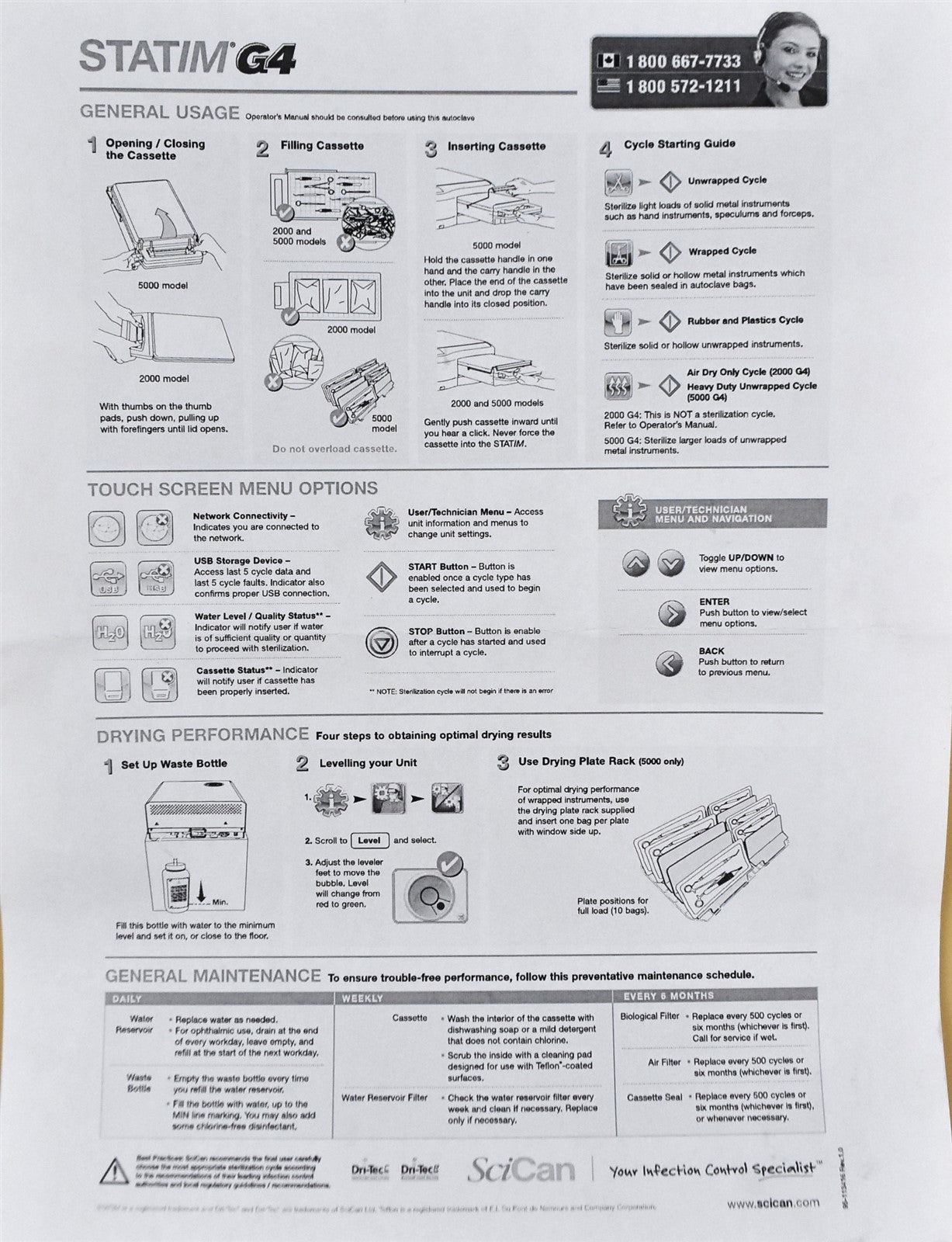 1 - SciCan STATIM 2000 G4 Cassette Autoclave 1 - Sterilizing Cassette w/ Rack 1 - Condenser Waste Bottle 1 - PM KIT 1 - Power Cord 1 - OEM Shipping Container
