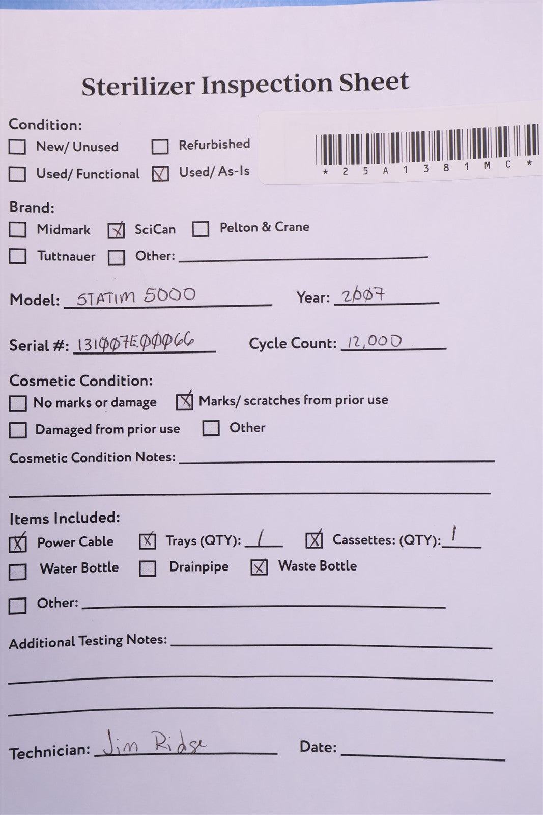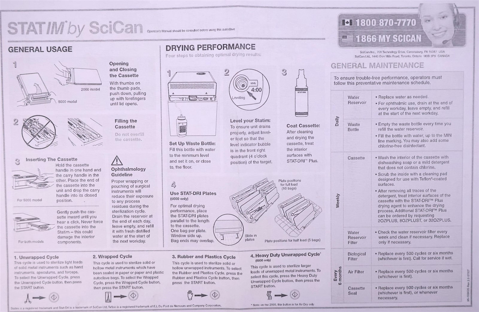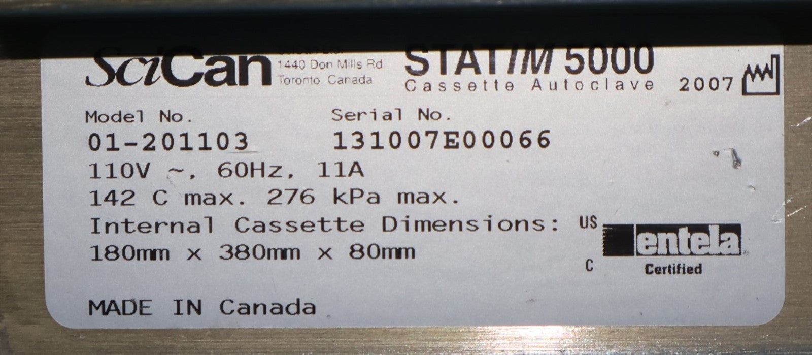 1 - SciCan STATIM 5000 Cassette Autoclave 1 - Sterilizing Cassette w/ Rack 1 - Condenser Waste Bottle 1 - Power Cord