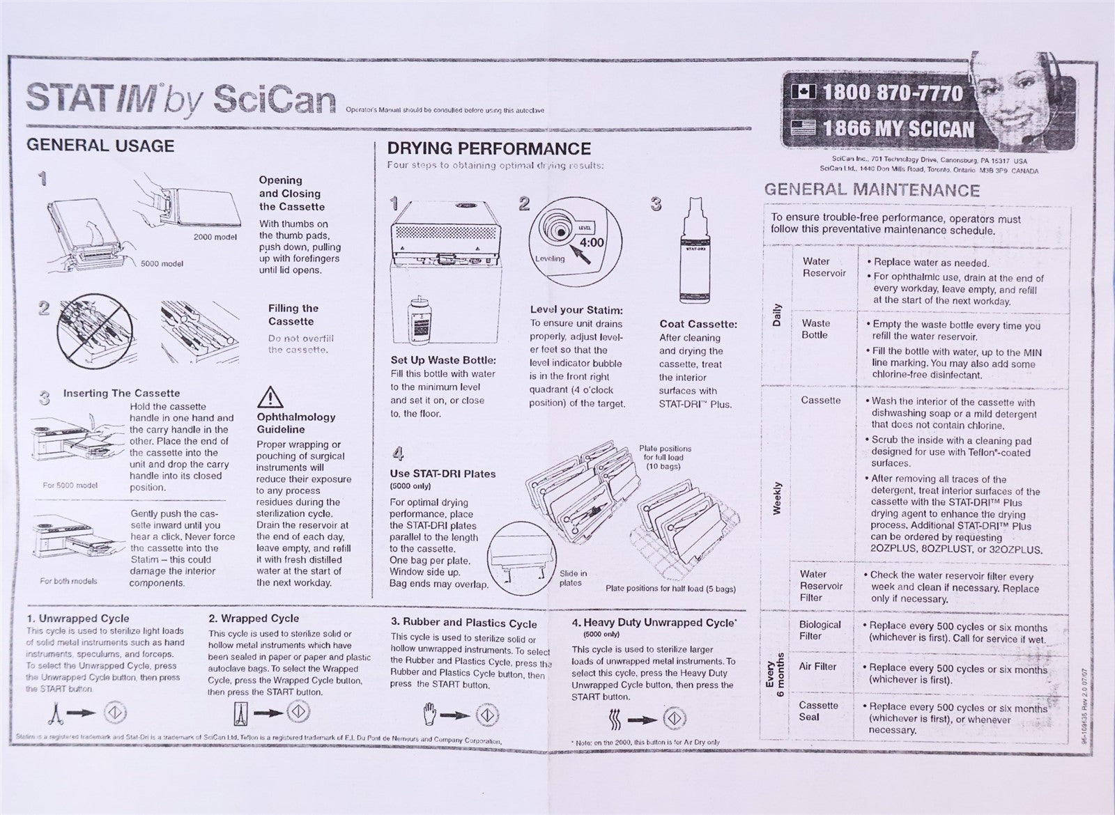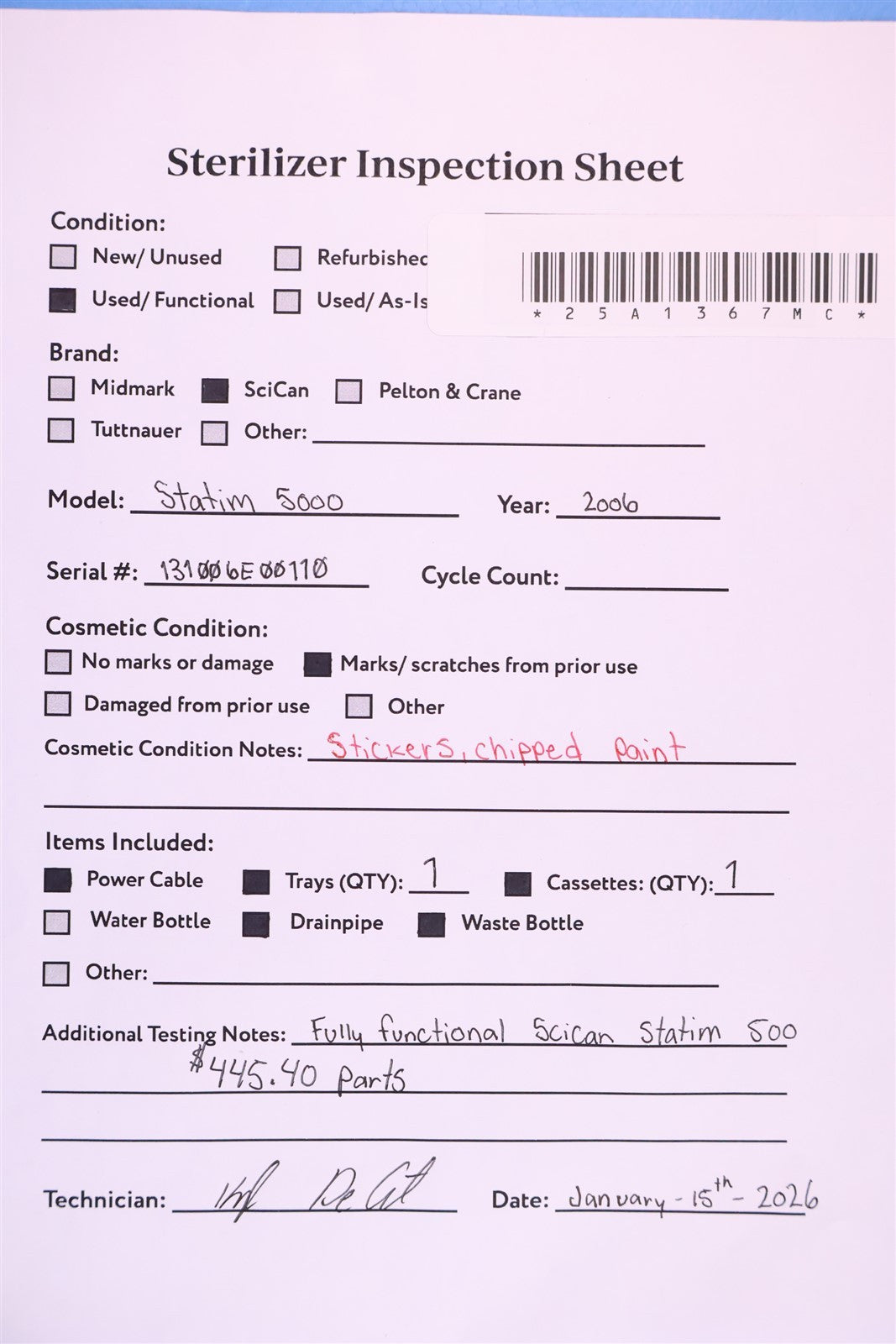 1 - SciCan STATIM 5000 Cassette Autoclave 1 - Sterilizing Cassette w/ Rack 1 - Condenser Waste Bottle 1 - Power Cord