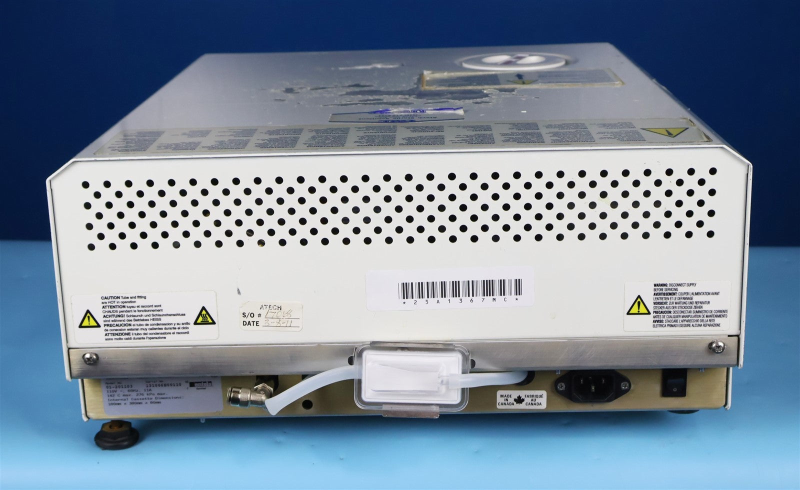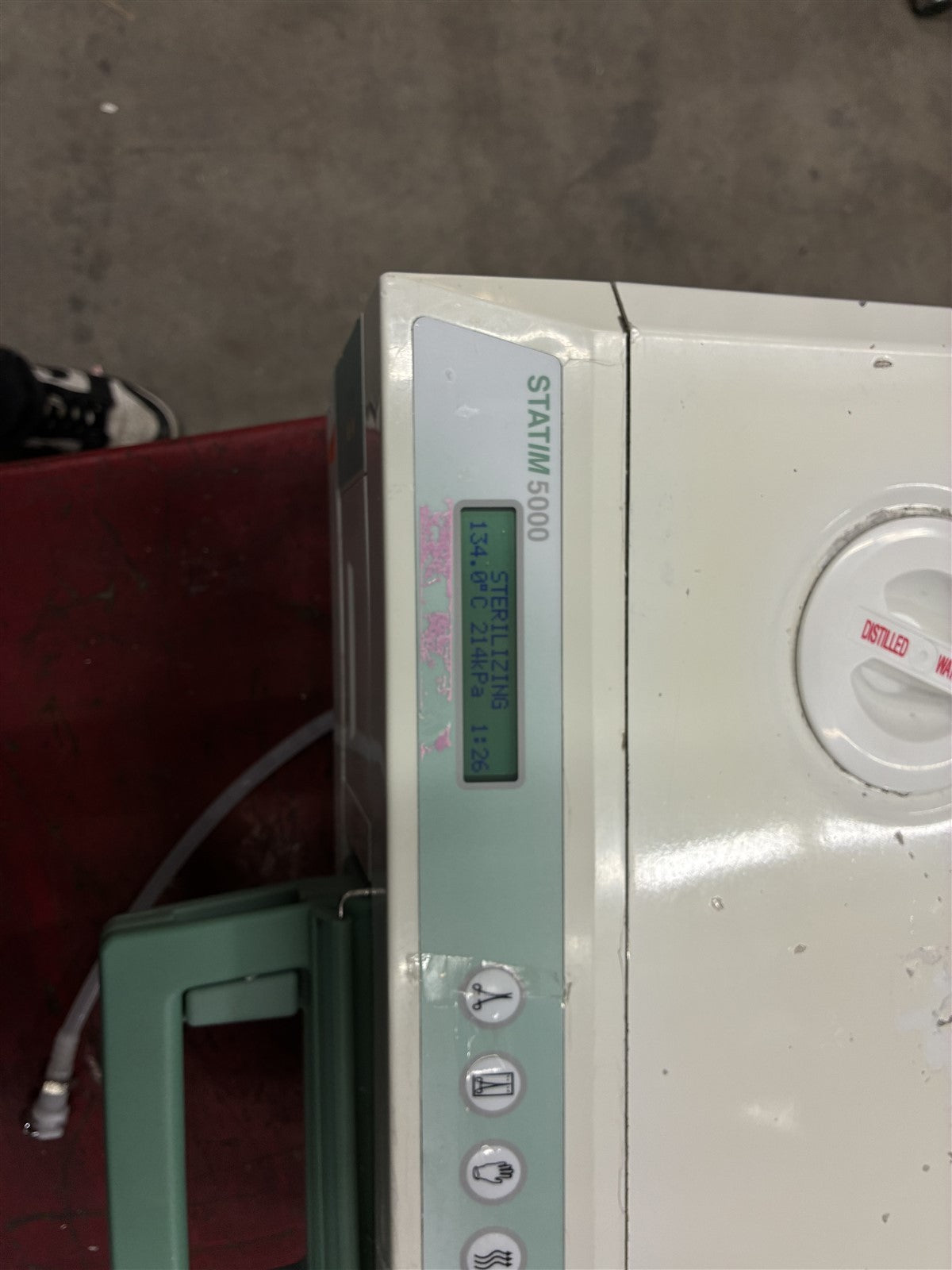 This autoclave was put through an initial functionality test, to prove that it does indeed work. Once it was proven to operate correctly, it was disassembled down to it's bare chassis and cleaned up, then reassembled. To insure it continued future operation, preventive maintenance parts were installed, which include, a new Water Pump, Air Valve, Check Valve, Safety Valve, Compressor Air Filter and Biological Filter. The Reservoir Tank was cleaned and flushed and a new Reservoir Cap, Reservoir Filter and Water Pump and Drain Kit Upgrade was installed. The sterilizing cassette was also cleaned and a new Cassette Seal was installed. Prior to running test cycles on this sterilizer, the temperature sensors were calibrated. Then this autoclave was tested through all it's preset sterilizing and drying cycles multiple times. To verify that this unit is achieving it's highest maximum required sterilization temperature, it was tested using a Max Register Thermometer and found to exceed 273 F while running a sterilization cycle.