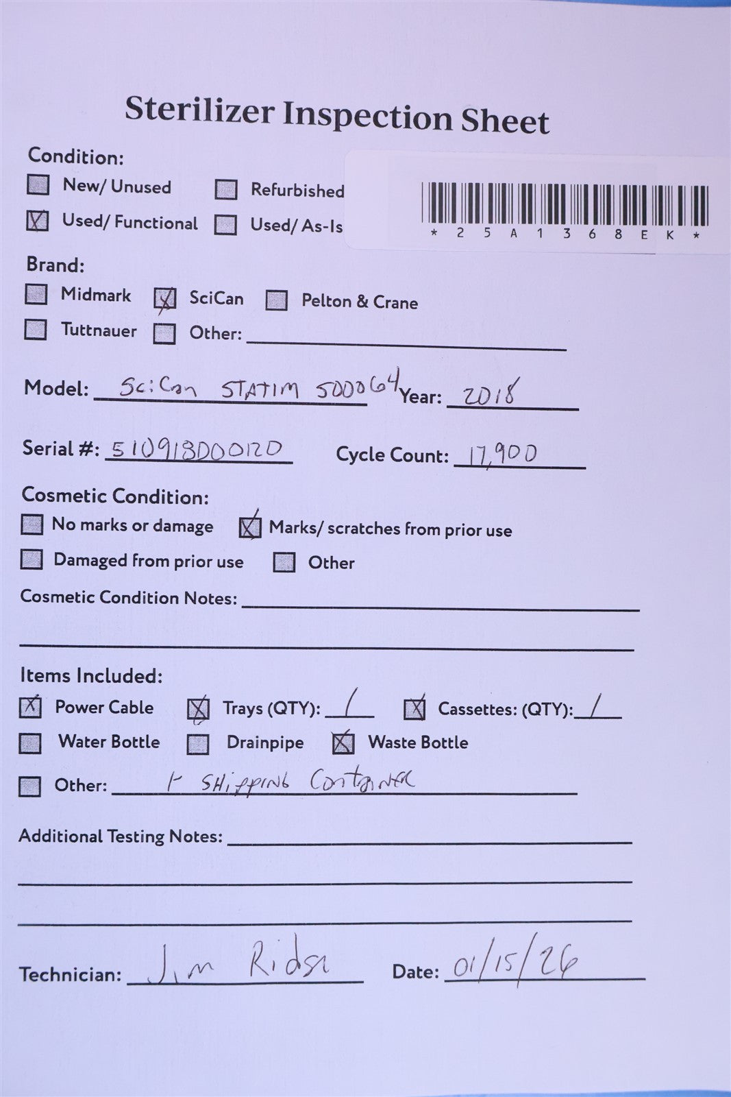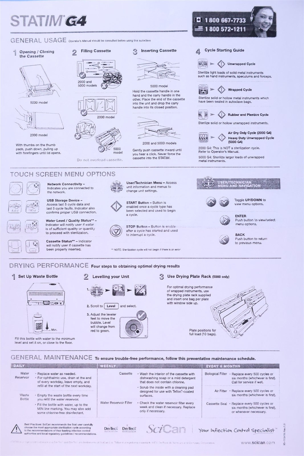 1 - SciCan STATIM 5000 G4 Cassette Autoclave 1 - Sterilizing Cassette w/ Rack 1 - Power Cord 1 - Condenser Waste Bottle 1 - Shipping Container