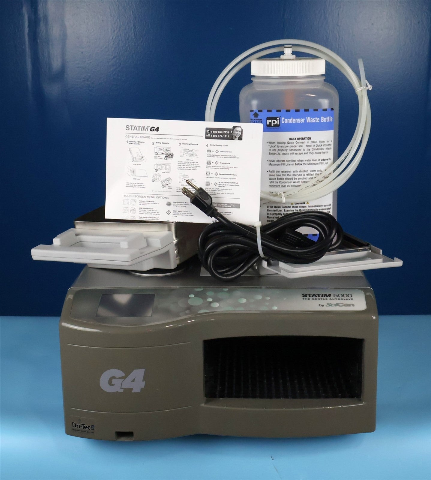 1 - SciCan STATIM 5000 G4 Cassette Autoclave 1 - Sterilizing Cassette w/ Rack 1 - Condenser Waste Bottle 1 - Power Cord