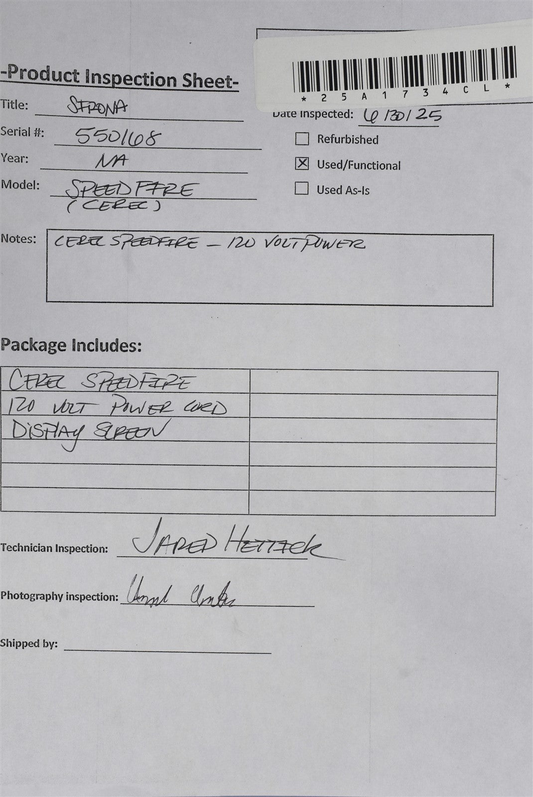 CEREC SPEEDFIRE, was inspected for physical damage, functionality, and safety. The exterior housing is intact with no visible cracks or dents. The door seal is in good condition with no sings of wear. The unit powered on successfully, and the control panel is fully functional. Ran temperature test: Pass. All controls are responsive. The unit has been cleaned and disinfected. Inspection Results: Passed- Ready for Resale