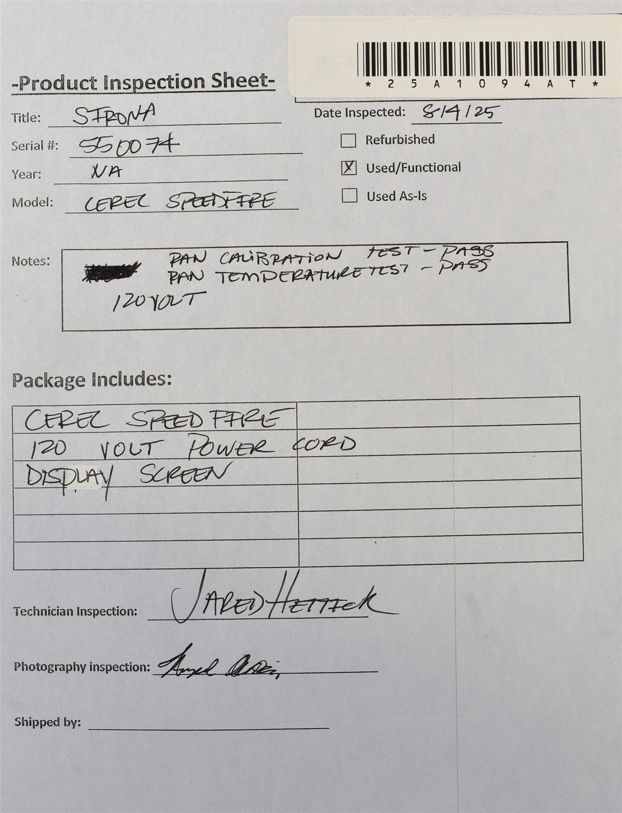 CEREC SPEEDFIRE, was inspected for physical damage, functionality, and safety. The exterior housing is intact with no visible cracks or dents. The door seal is in good condition with no sings of wear. The unit powered on successfully, and the control panel is fully functional. Ran temperature test: Pass. Calibration tested: pass. All controls are responsive. The unit has been cleaned and disinfected. Inspection Results: Passed- Ready for Resale