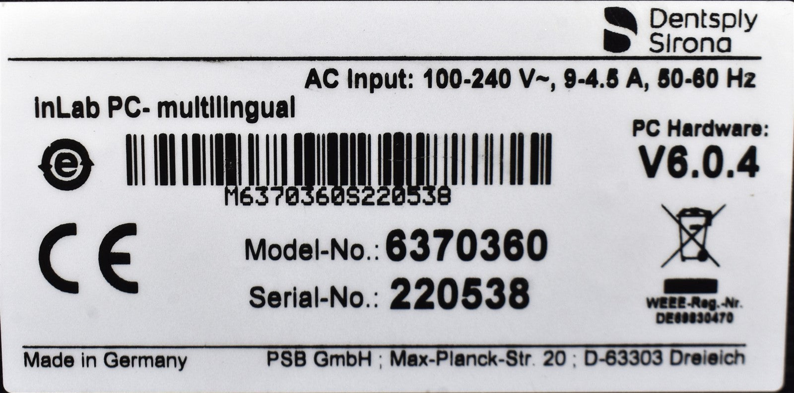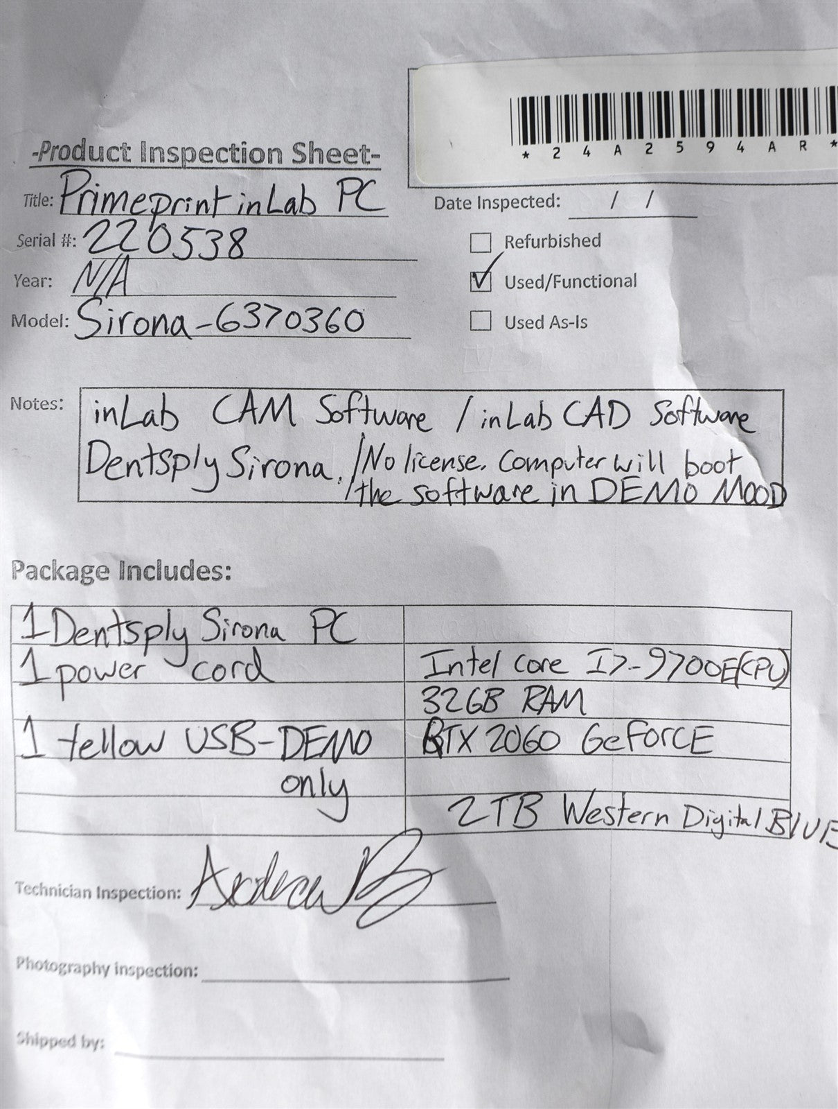 1 Dentsply Sirona PC, 1 Power Cord, 1 Yellow USB Software DEMO Key