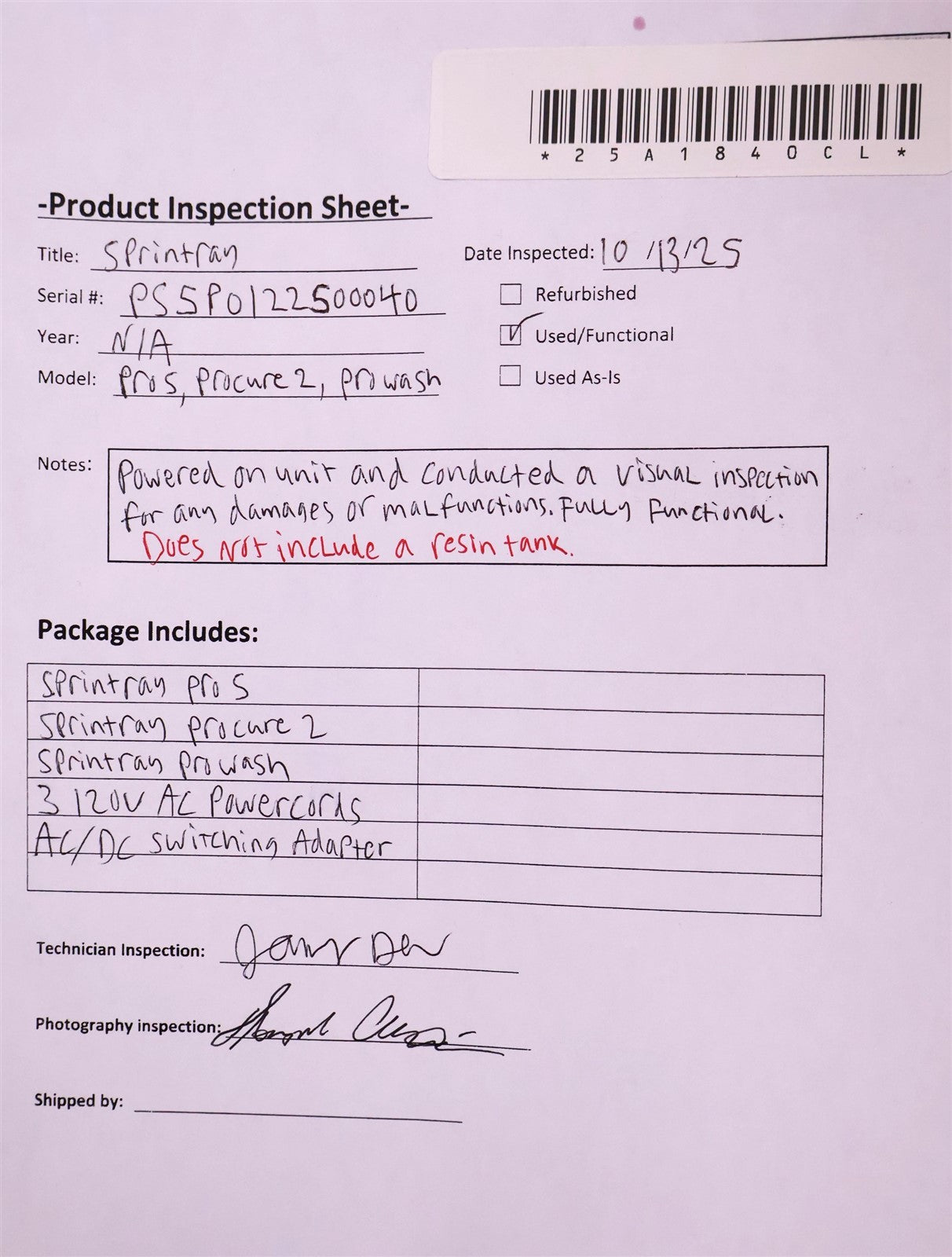 Your purchase will NOT include:Resin Tank.This product is pre-owned and may not include the same accessories as a new, unused unit. - other accessories not shown or listed here.Powered on the Unit and Conducted a Visual Inspection for any Damage or Malfunctions. Tested the Display Screen—Confirmed Full Functionality. The Pro Wash Has Residue on The Top Right Corner Of Unit.