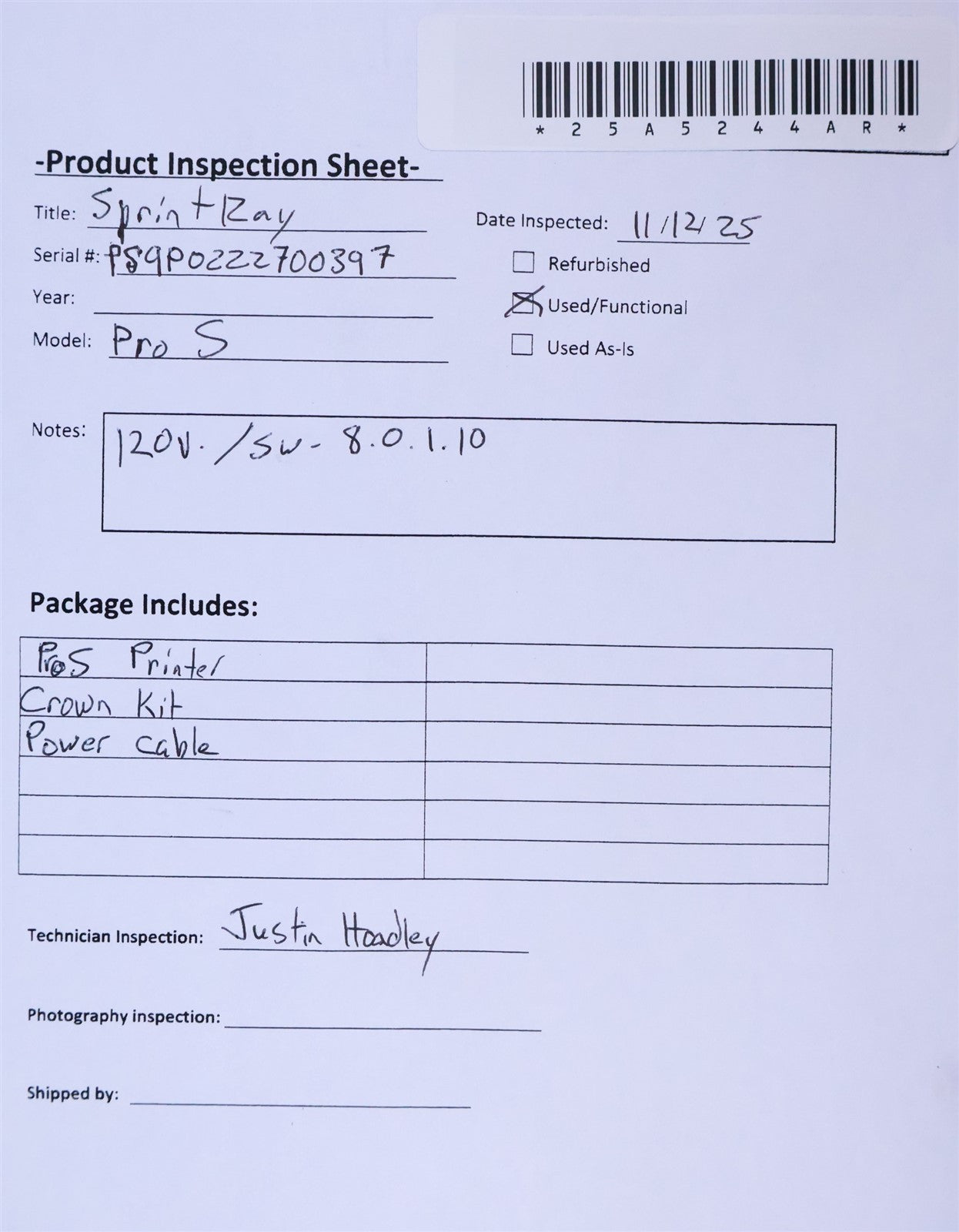 The SprintRay Pro S unit was powered on and its touchscreen interface was verified for full operational responsiveness. The internal heating system was tested and confirmed to be functioning within expected parameters. Network connectivity was established successfully via Wi-Fi, ensuring seamless integration with SprintRay’s cloud-based workflow. Based on these evaluations, the unit appears to be fully functional and ready for clinical deployment.