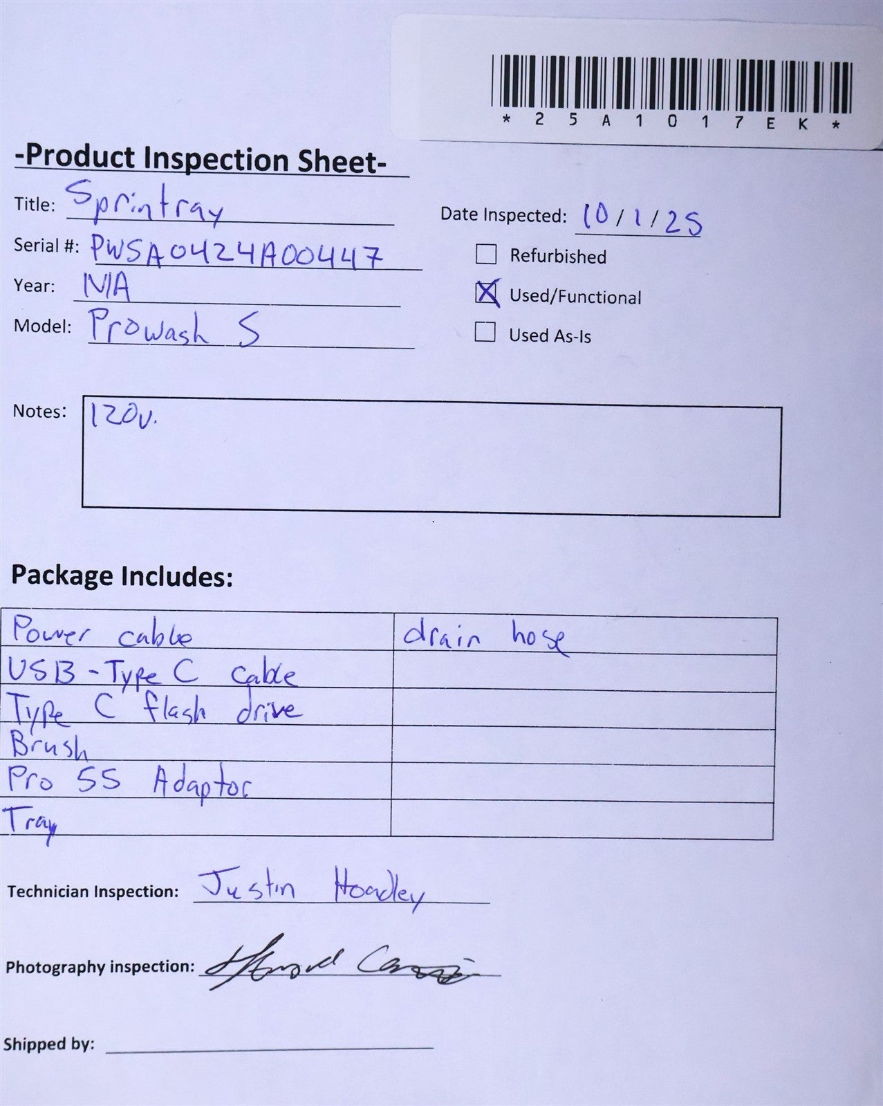 - Power Requirements: 120V