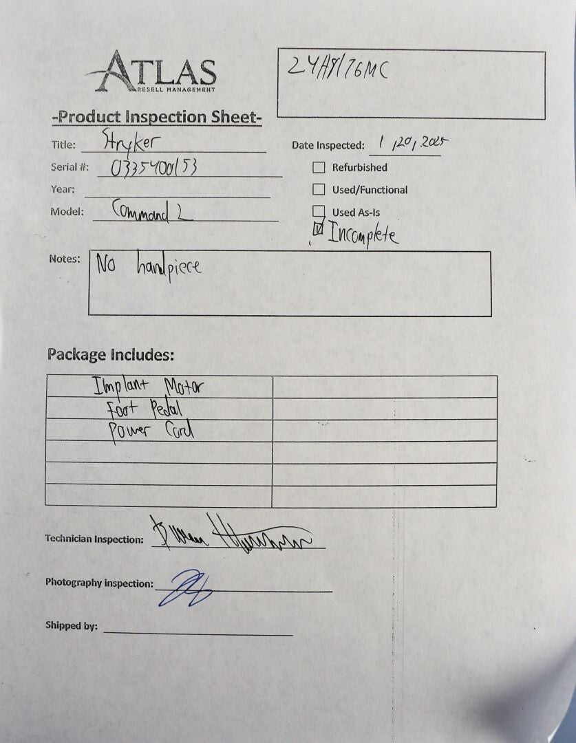 Your purchase will NOT include: manufacturer warranty, or any other accessories not shown or listed here.I didn't have the handpiece to test this or mark it as functional. The cosmetic condition is relatively good, with marks on the surface of the implant motor and significant cracks on its plastic section. -BH