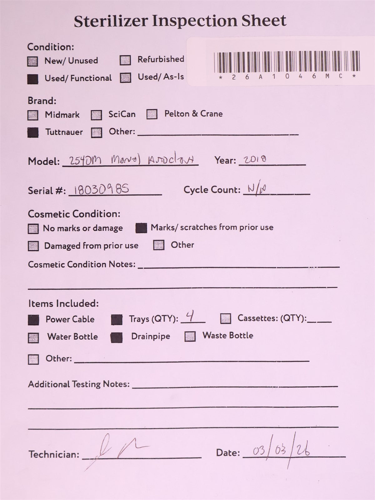 Your purchase will NOT include: This product is pre-owned and may not include the same accessories as a new, unused unit. - other accessories not shown or listed here.This autoclave is a 2018 model with an unknown number of cycles run on it, due to it being a manual model autoclave. Initial testing of this autoclave reveled that it had numerus issues that needed attention before the sterilizer could be tested. All the known issues were taken care of, which included replacing the Door Switch, Power Switch and Multi-Purpose Valve. Then the Reservoir Tank was cleaned and flushed and a new Safety Valve, Condenser Coil, Air Jet Valve and Reservoir Cap were installed. Cleaned the sterilizing chamber and installed a new Door Gasket and Door Bellows Assembly. Cleaned the sterilizing trays and rack. To test this autoclave, it was first connected to a 120 volt power source, distilled water was added, it was then properly levelled as per it's chamber size requirement and then testing began. This sterilizer was run through cycles of 270 F for 10 minutes and 250 for 30 minutes several times. To verify that this autoclave is achieving it's maximum required sterilizing temperature during a cycle, it was temperature tested with the use of a Max Register Thermometer, and found to exceed 270 F during a sterilization cycle.