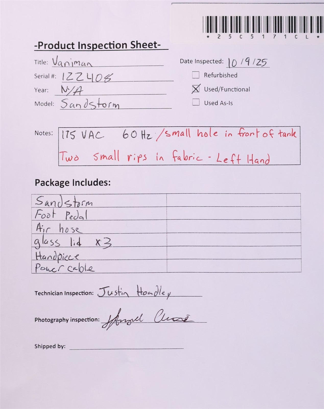 Your purchase will NOT include:This product is pre-owned and may not include the same accessories as a new, unused unit. - other accessories not shown or listed here.The unit was subjected to a comprehensive visual inspection. All primary components appear to be functioning as intended; however, two anomalies were noted: a small perforation located at the lower front section of the tank, and a tear in the fabric on the left-hand side. These issues may warrant further evaluation to determine their impact on overall performance and structural integrity.