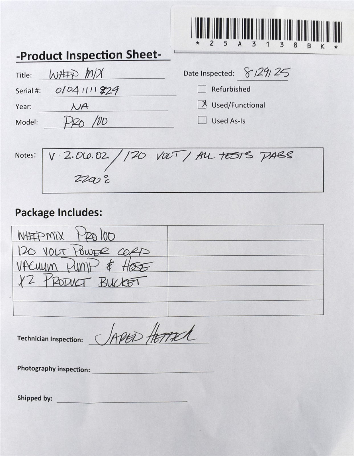Whip mix Pro100, 120 volt power cord. Vacuum pump and hose. x2 product buckets.